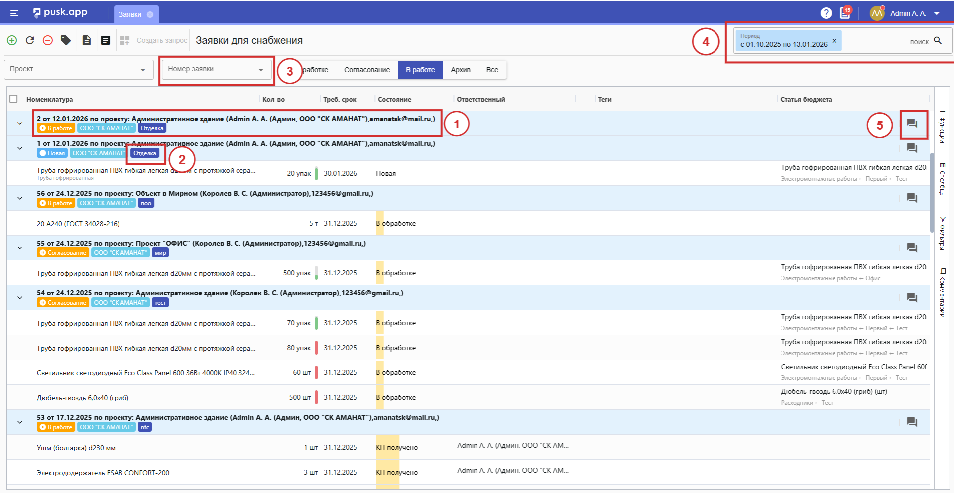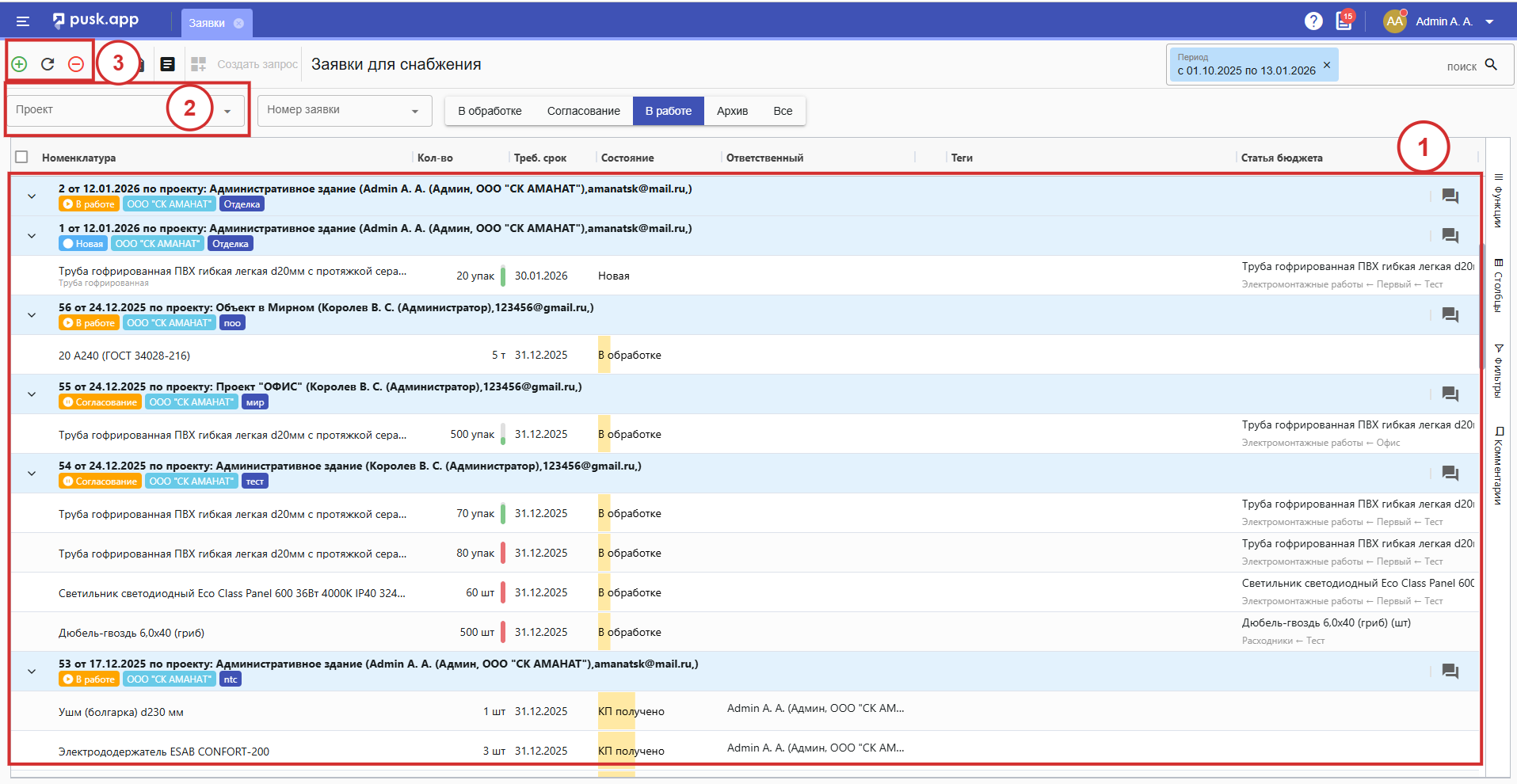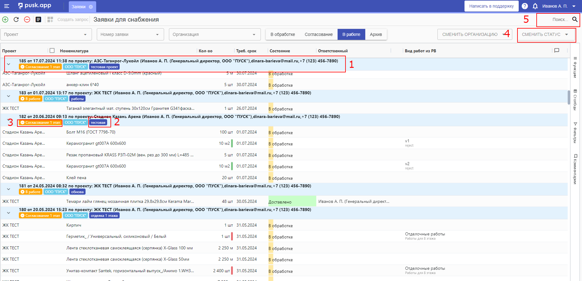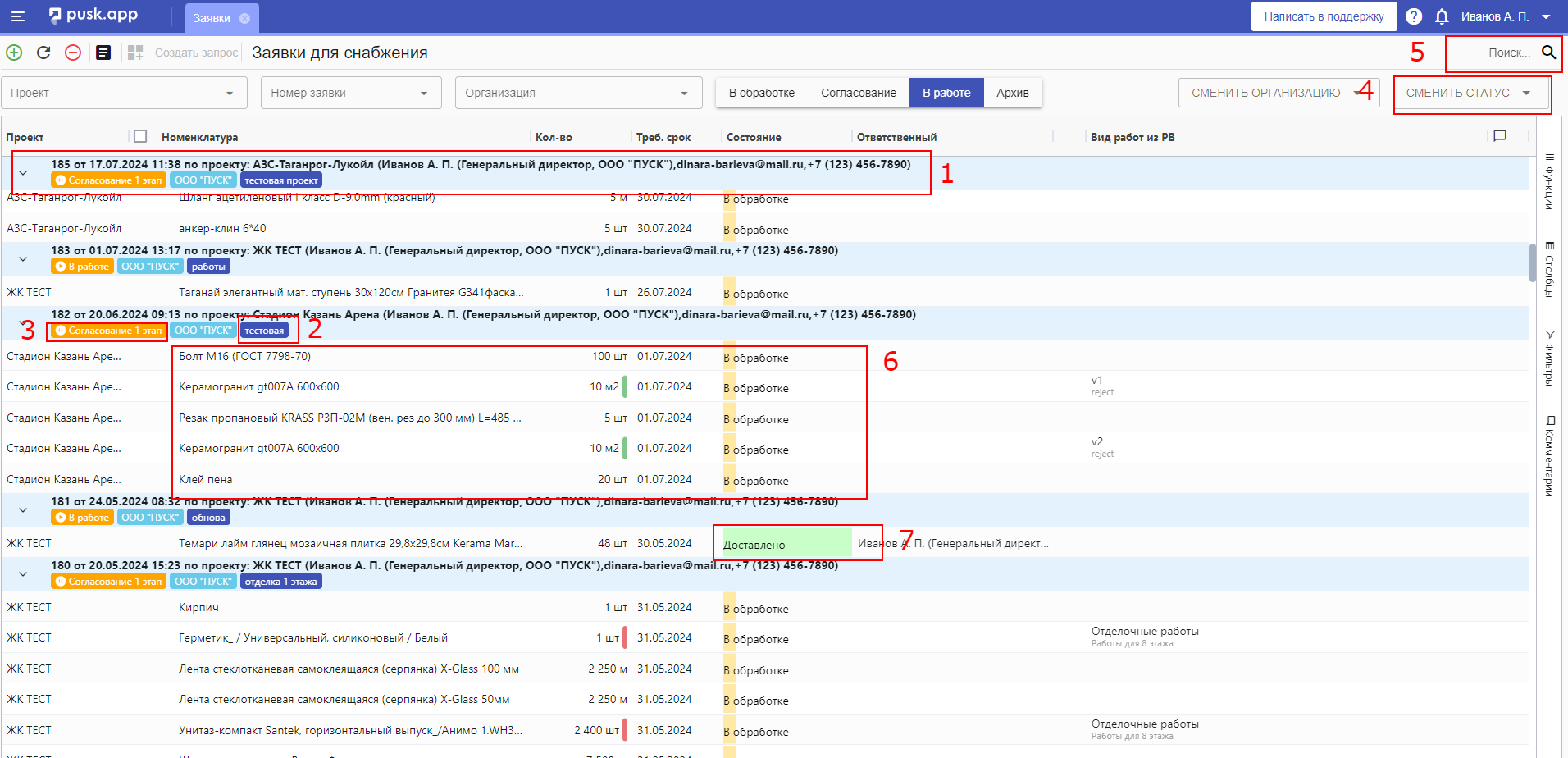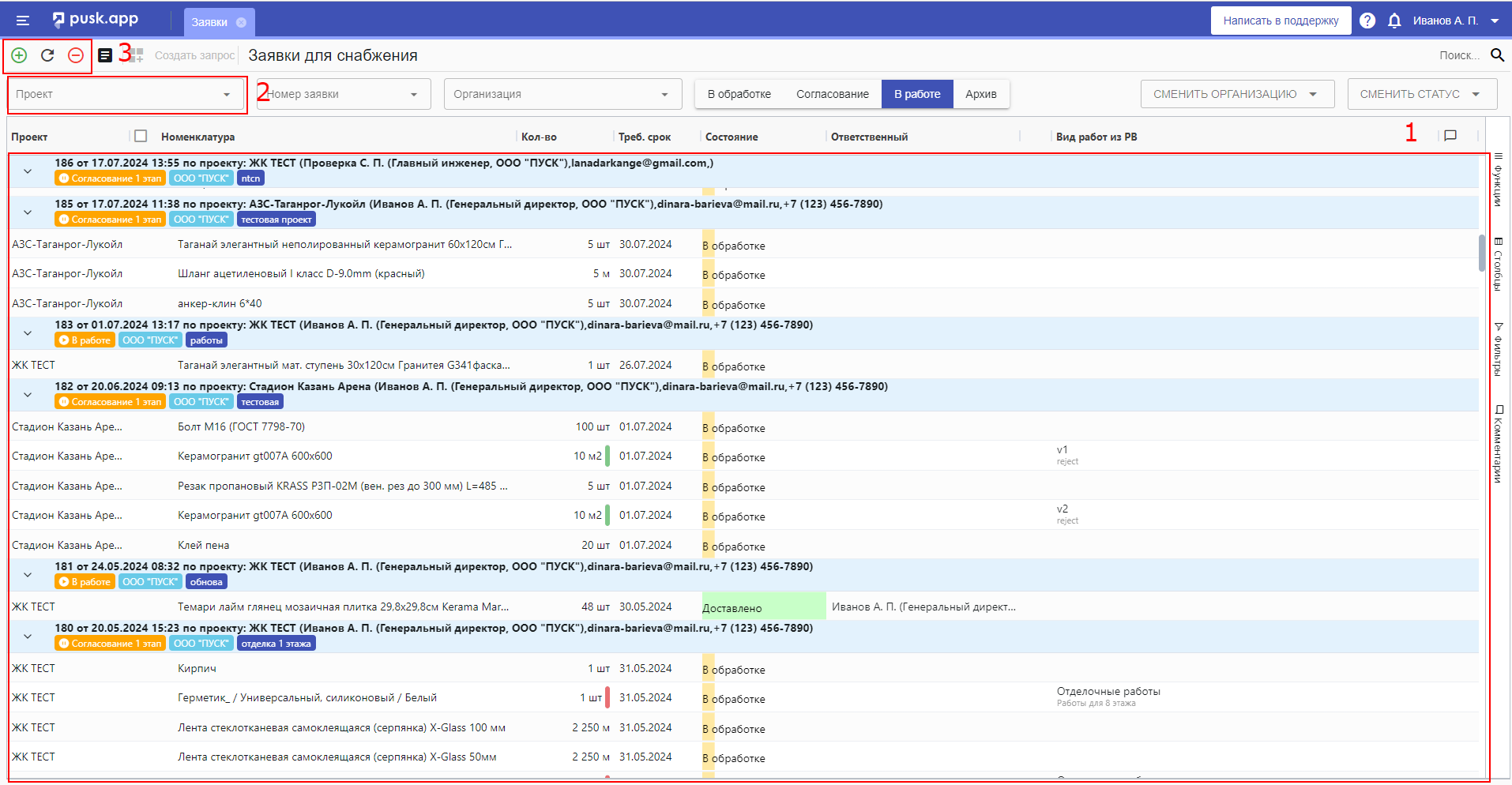 Без материалов не может обойтись ни один проект. Чтобы заказать материалы, каждой организации необходимо сформировать и отправить заявку поставщику для снабжения. В системе предусмотрен специальный раздел "Заявки", в котором можно вести все заявки, отслеживать их оплату и исполнение.