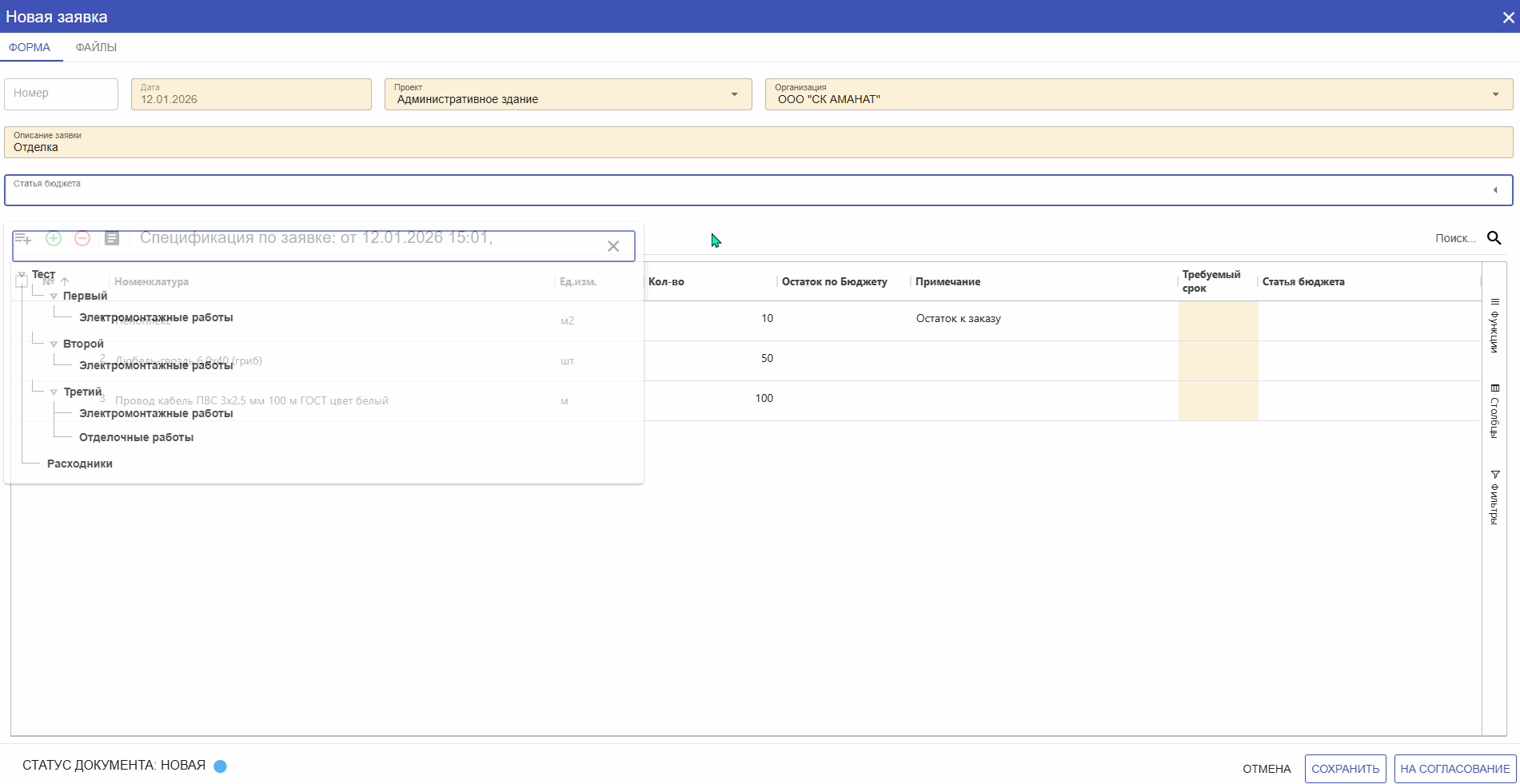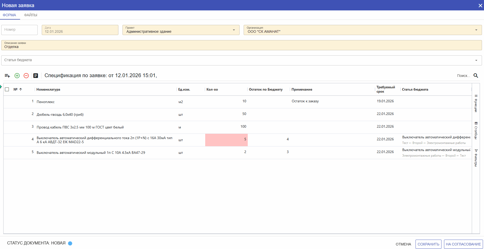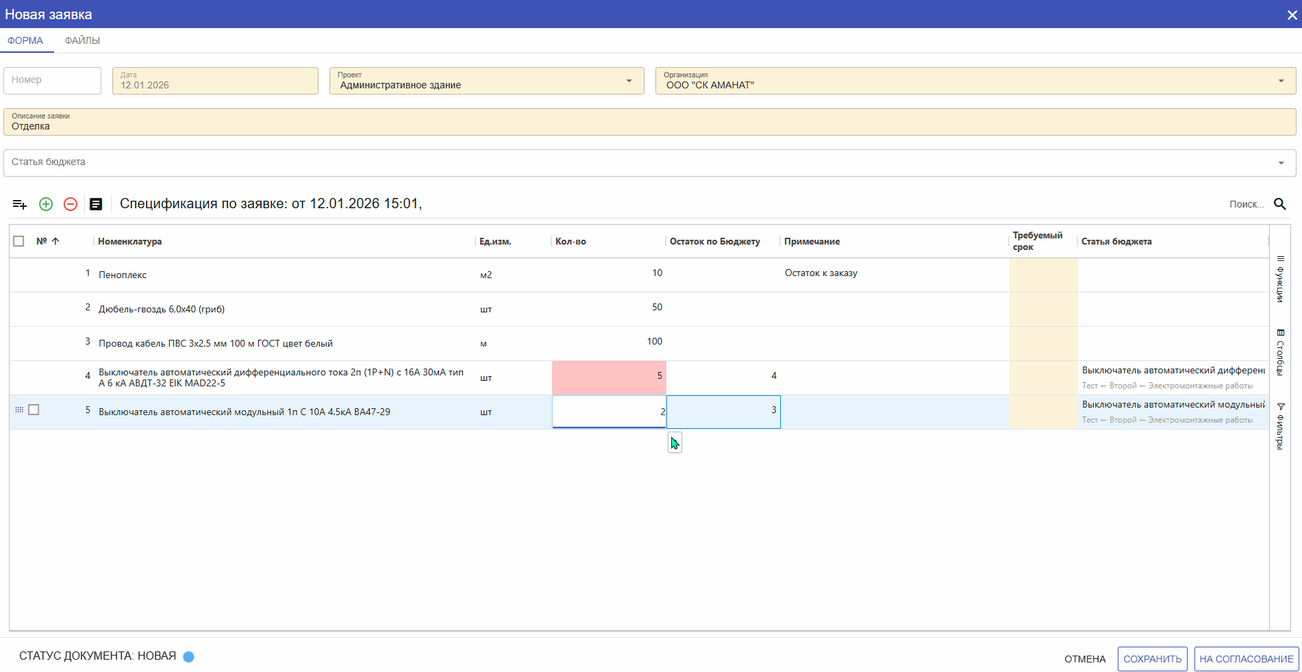 В форме создания заявки, в уже добавленных позициях из Бюджета есть возможность редактирования наименования материала, но хотим обратить внимание на то, что в самом Бюджете наименование не поменяется. Однако эта измененная позиция уйдет в счет позиции из Бюджета.