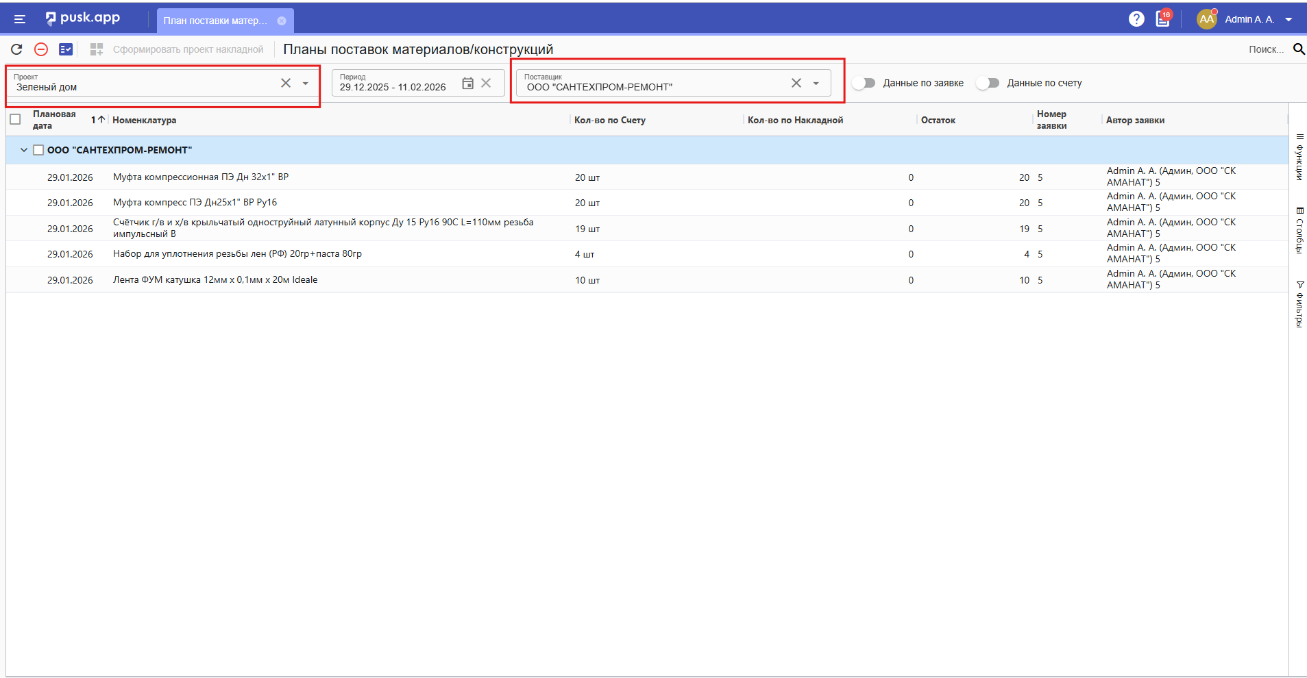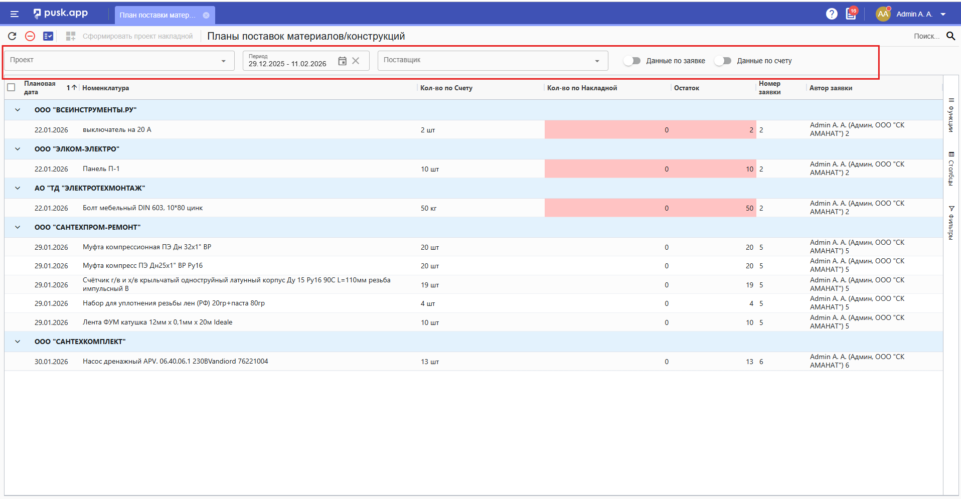2. В плане поставки материалов Сортировка идет по проекту. Здесь же можем выбрать период, за который хотим увидеть план поставки материалов, и поставщика. Вывести данные по счету или отобразить данные по заявке.