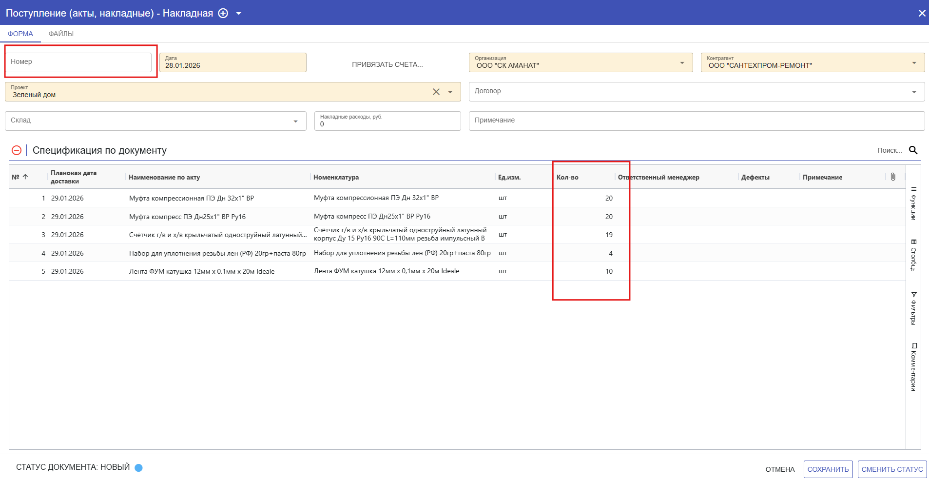 Сверяем количество поступившего материала. Если количество не соответствует поставке, то указываем фактическое количество поступившего материала