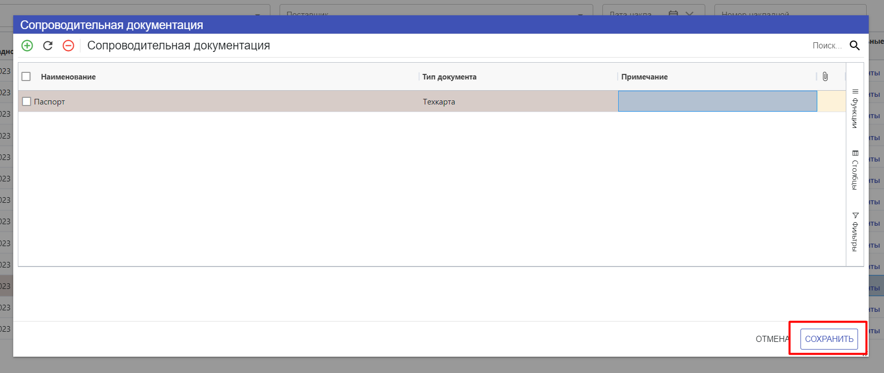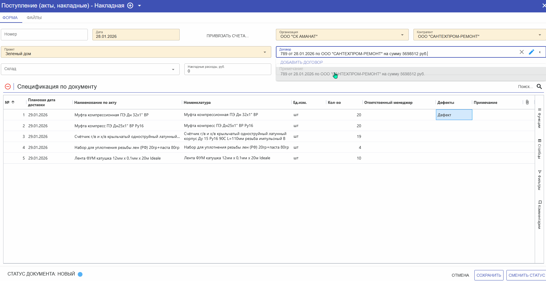 Проект накладной ушел на согласование для сверки накладной от поставщика с тем, что фактически было поставлено на объект. Документацию(паспорта, сертификаты) на материалы и услуги мы можем прикрепить в разделе "Журнал входного контроля"
