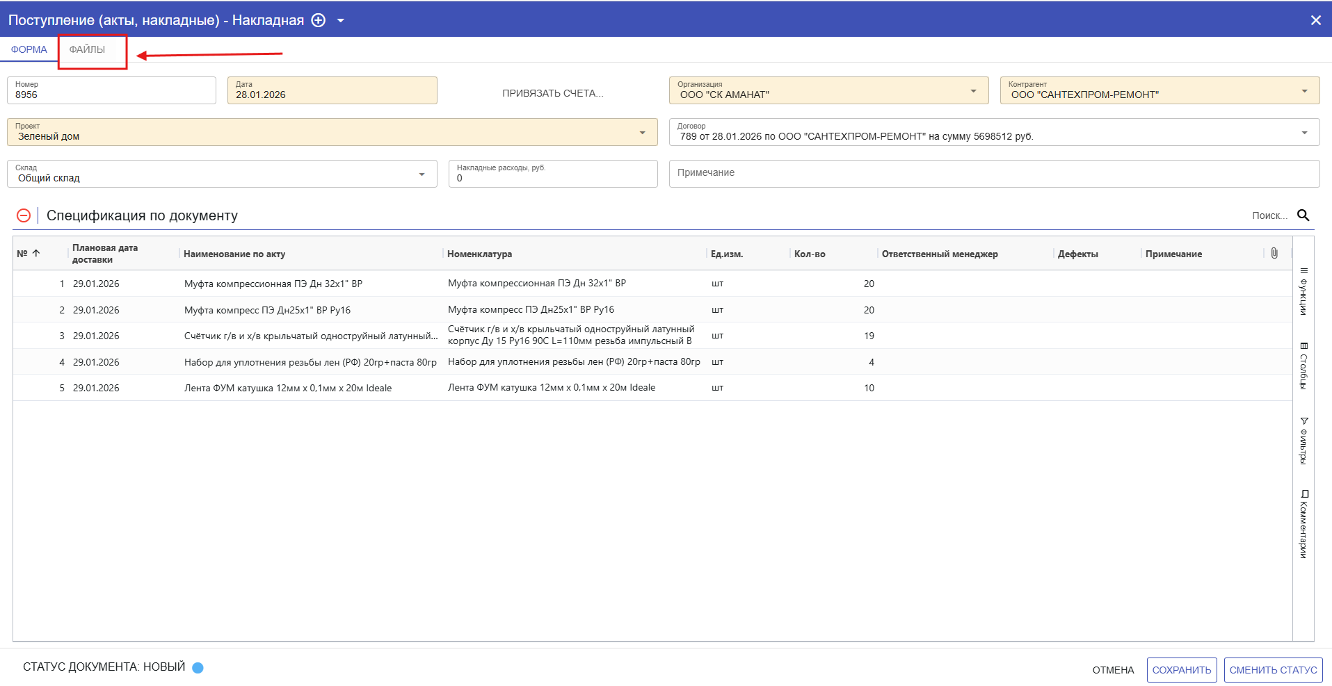 3. Для добавления сопроводительной документации кликаем на скрепку "Файлы"