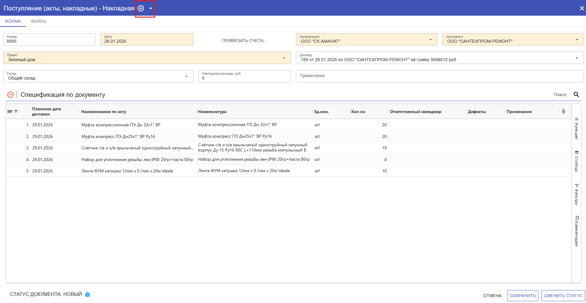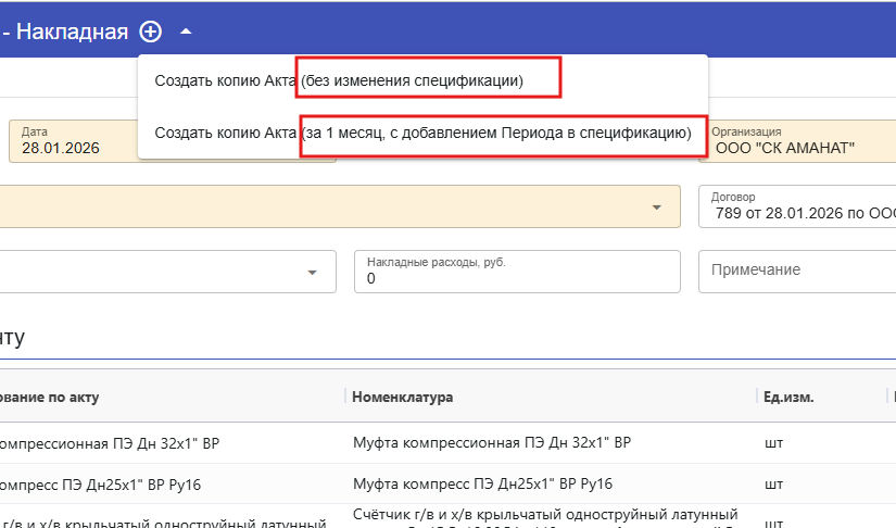 В открывшемся окне проекта накладной можно создать копию Акта. Для этого кликаем на плюсик в круге