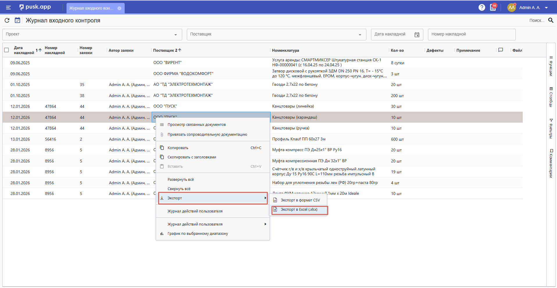 Журнал входного контроля можно выгрузить из системы в формате Excel. Для этого, на любой позиции кликаем правой кнопкой мышки -> Экспорт -> экспорт в Excel