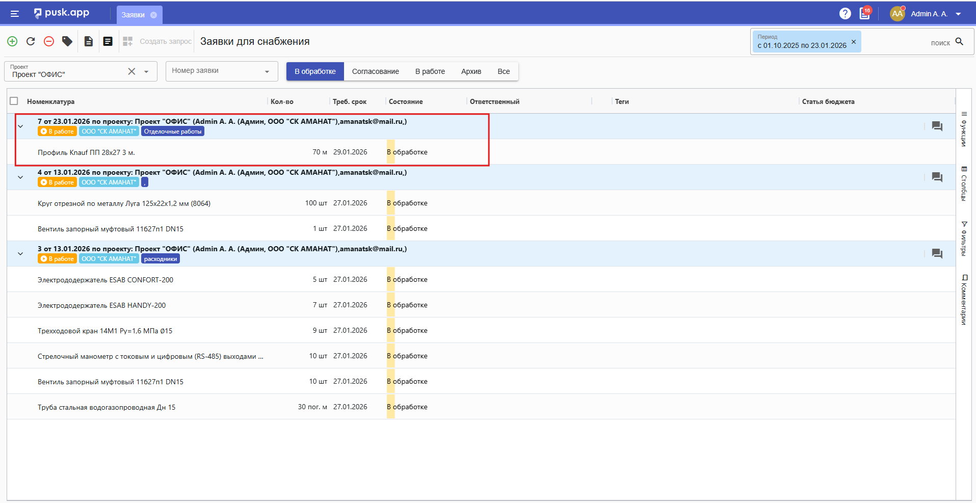 3. Далее эта позиция попадает снова в обработку в раздел "Заявки", чтобы из нее можно было создать новый запрос.