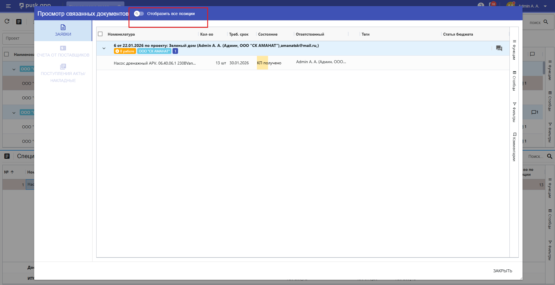 Чтобы просмотреть информацию по заявке, внизу реестра, в спецификации по запросу, кликаем правой кнопкой мыши и выбираем "Просмотр связанных документов". Далее в режиме просмотра связанных документов можем выбрать "Отобразить все позиции".