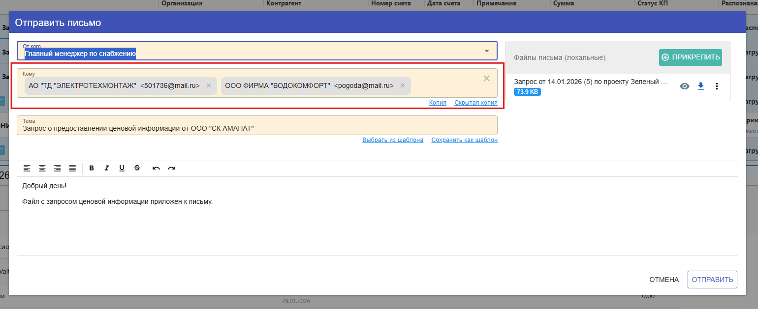 В поле «Кому» укажите email поставщика, которому хотите отправить запрос.