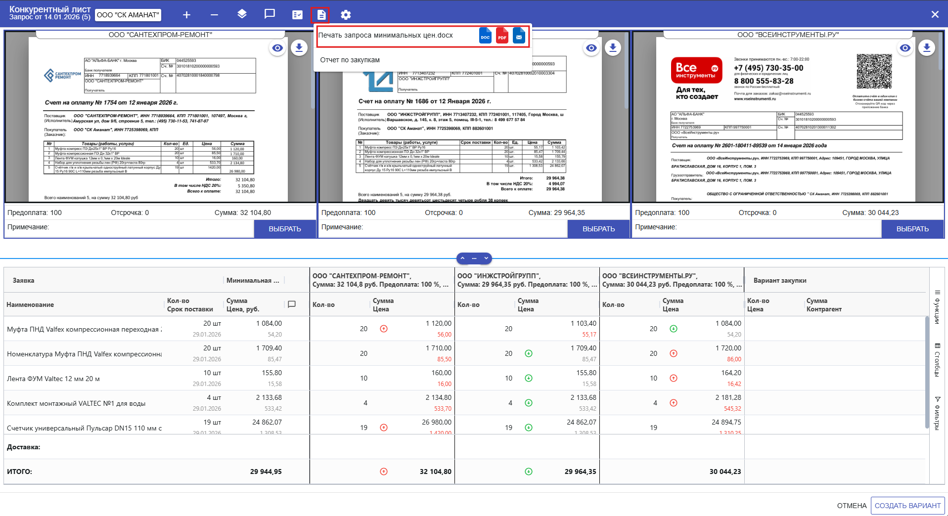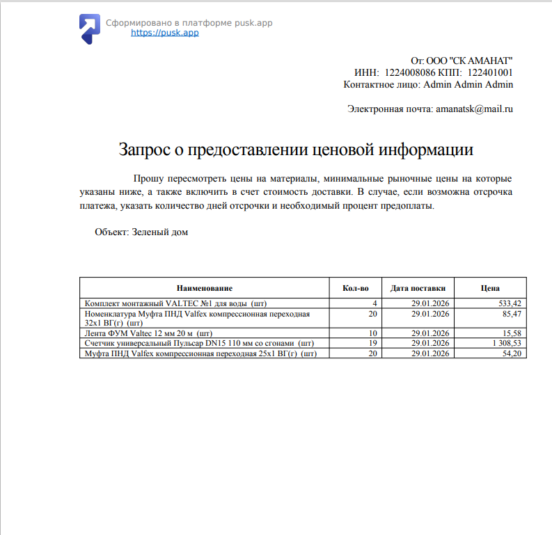 Реализована печатная форма документа, предназначенная для направления поставщику запроса о пересмотре ценовых условий. Печатная форма позволяет автоматически подставлять минимальные цены от других поставщиков и отправлять этот список выбранному поставщику с просьбой пересмотреть свою цену в сторону снижения.