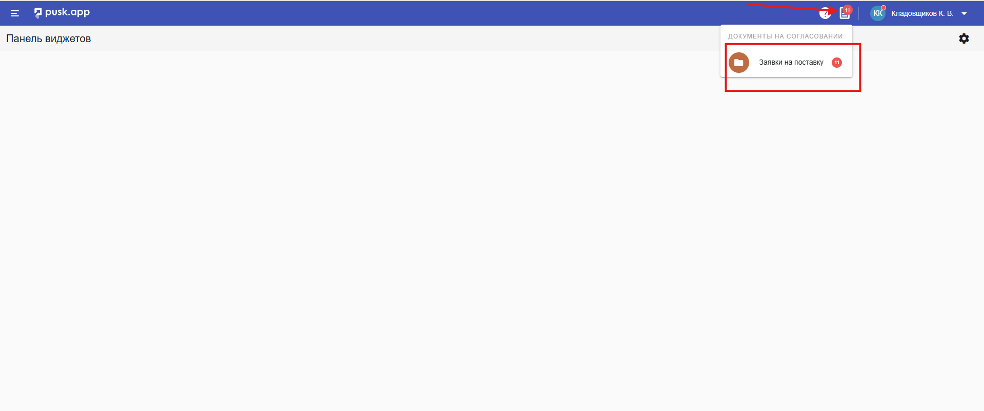 Если вы являетесь участником процесса согласования и есть документ на Вашем этапе, то в правом верхнем углу будет активным Индикатор с количеством документов, по которым необходимо принять решение. Нажав на него, откроется список с документами.