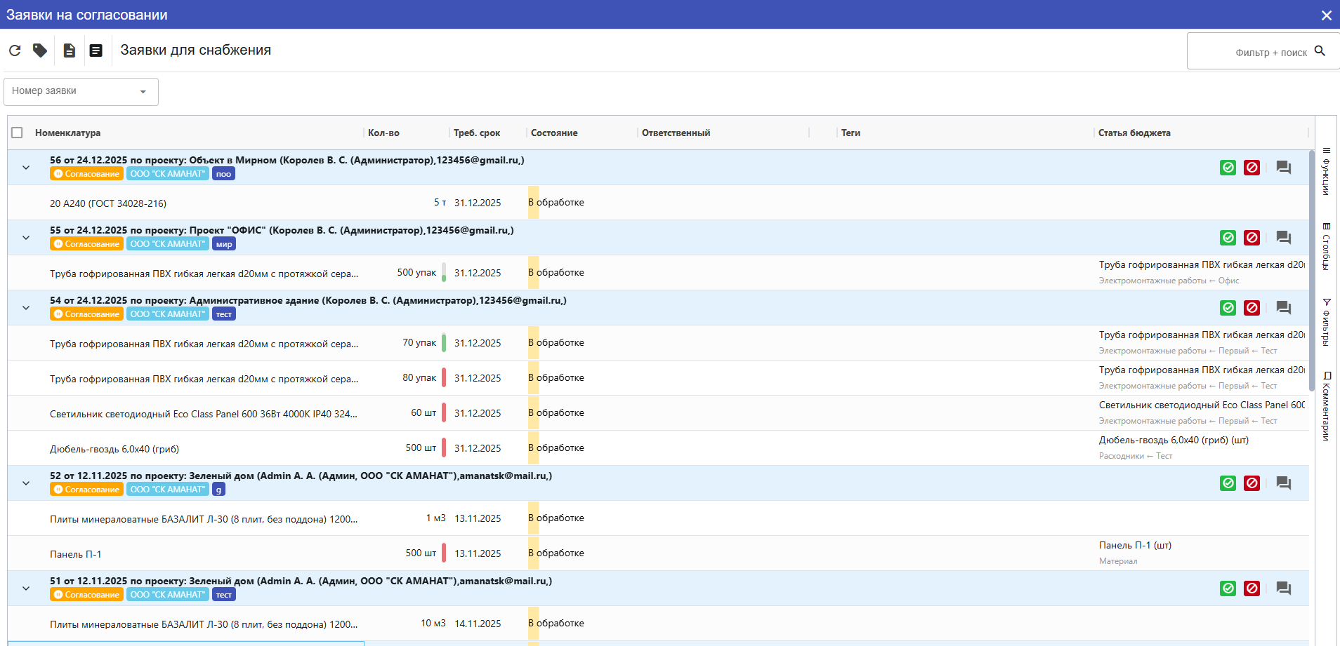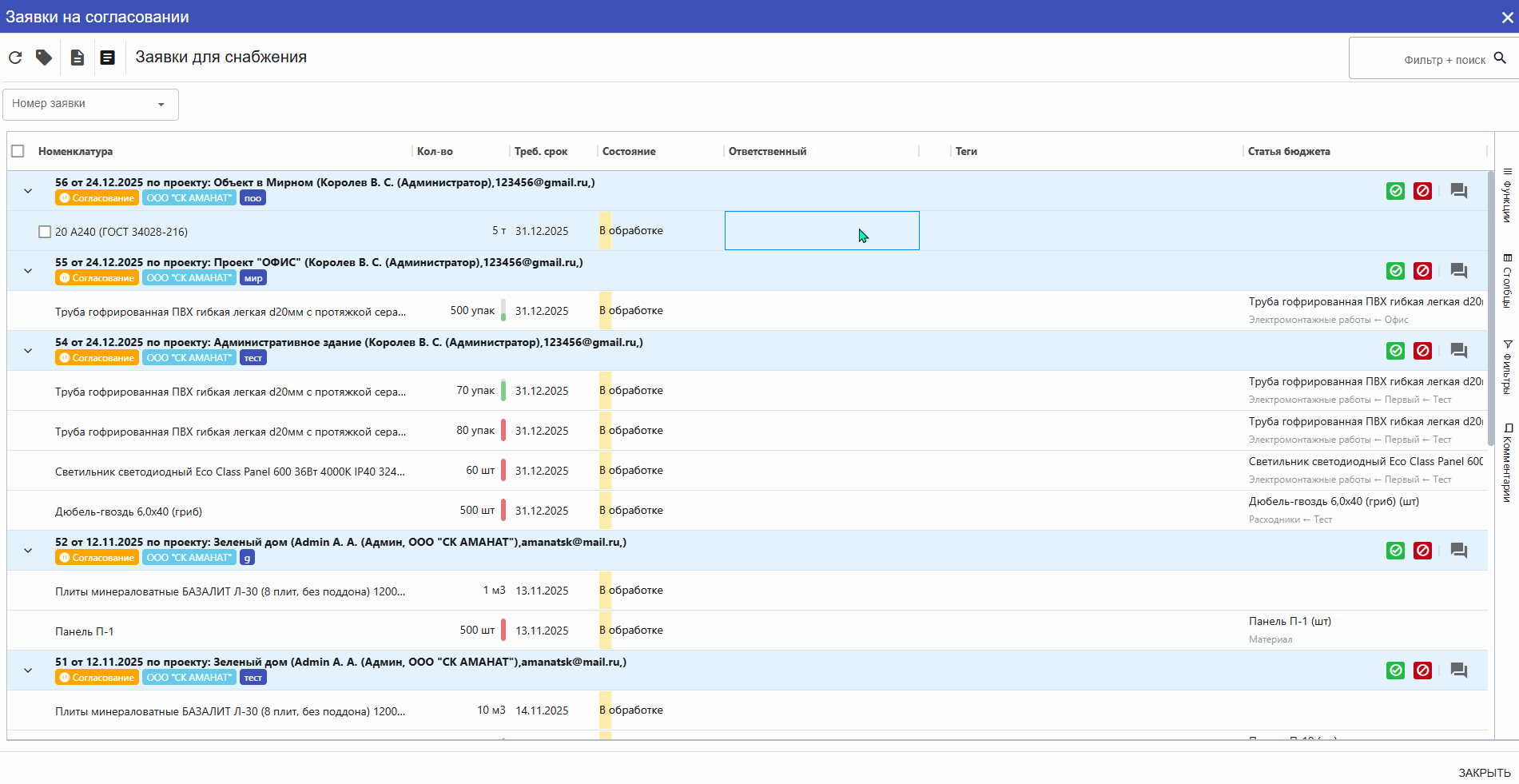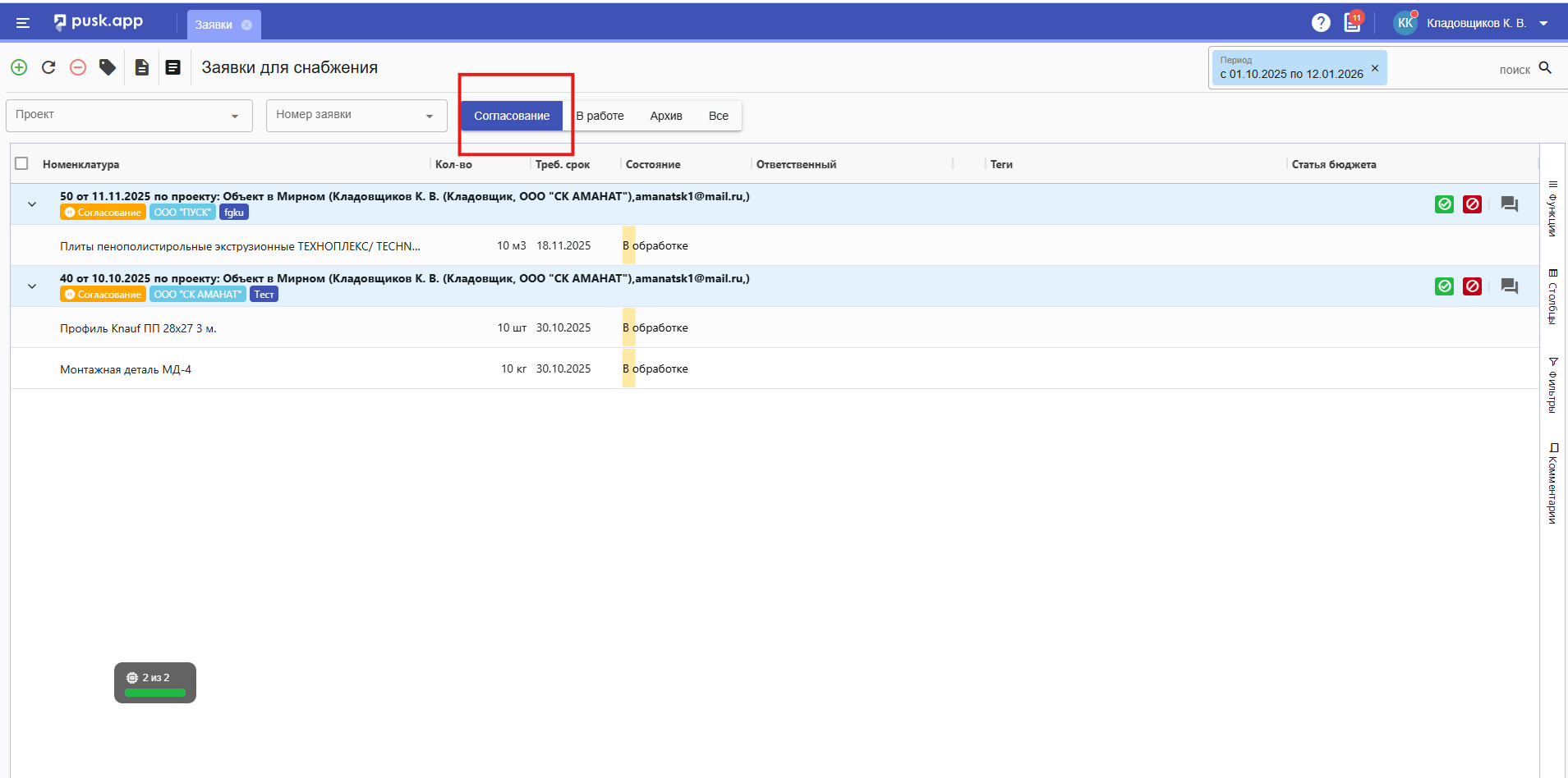 Как только все ответственные сотрудники проверят документ, согласуют его, то статус Заявки сменится на В Работе - что означает, что документ прошел все этапы проверок и согласования и передан в Снабжение.
