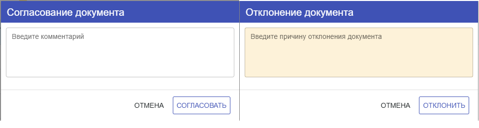 4. При согласовании документа, выйдет окно Комментария. Для заполнения обязательным (подкрасится бежевым) становится только при условии Отклонения Документа. При положительном результате, комментарий заполнять не обязательно.