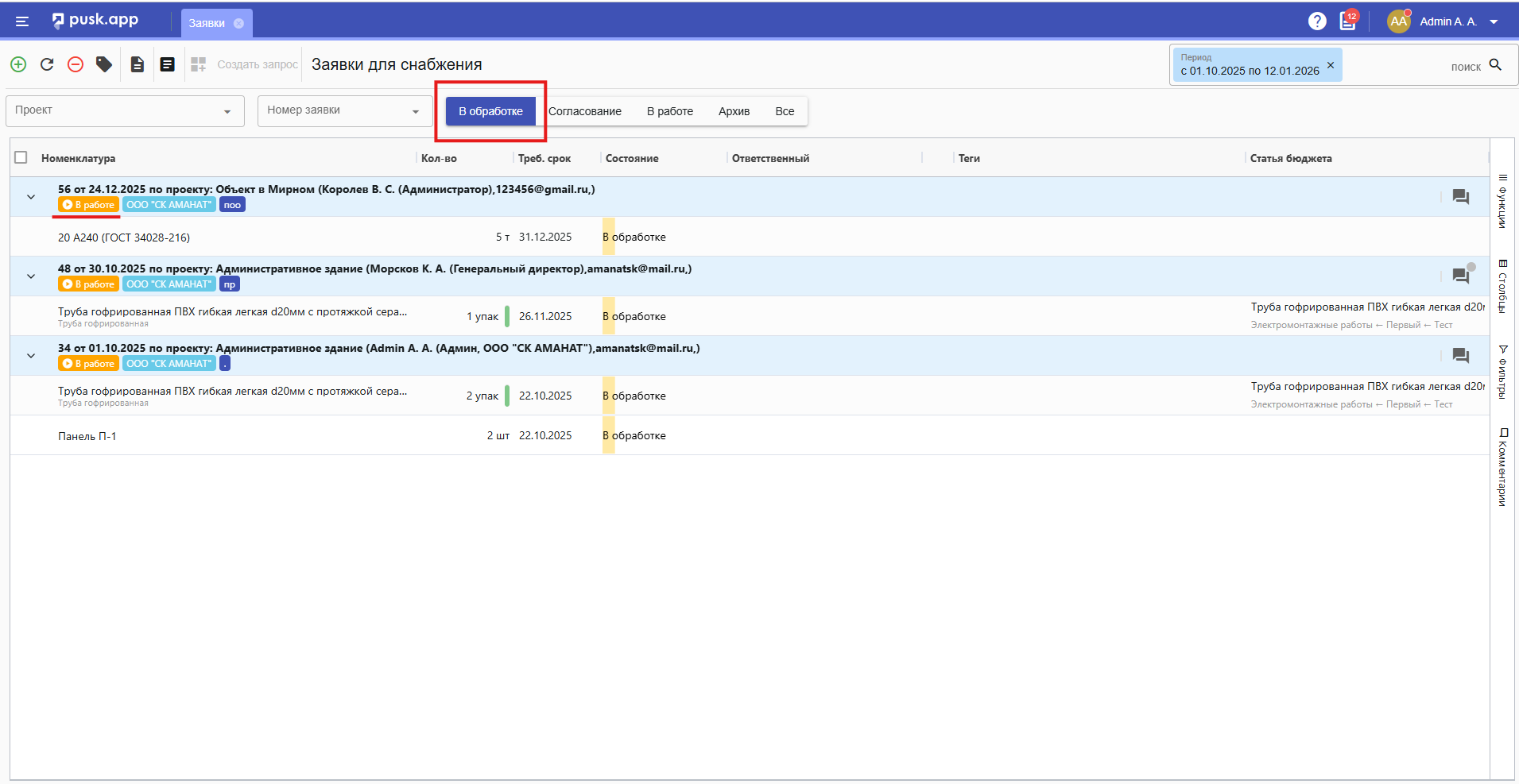 1. Переходим в Меню - Материалы - Заявки