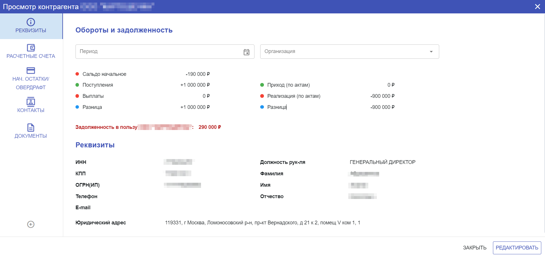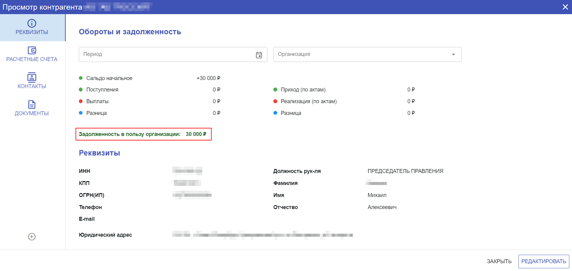 Для того, чтобы информация о дебиторской/кредиторской задолженности была актуальной, для контрагентов, по которым у организации уже были взаиморасчеты, нужно указать начальное сальдо. Сальдо указывается в форме редактирования контрагента. Затем и сальдо, и обороты по контрагенту отображаются в форме просмотра контрагента.