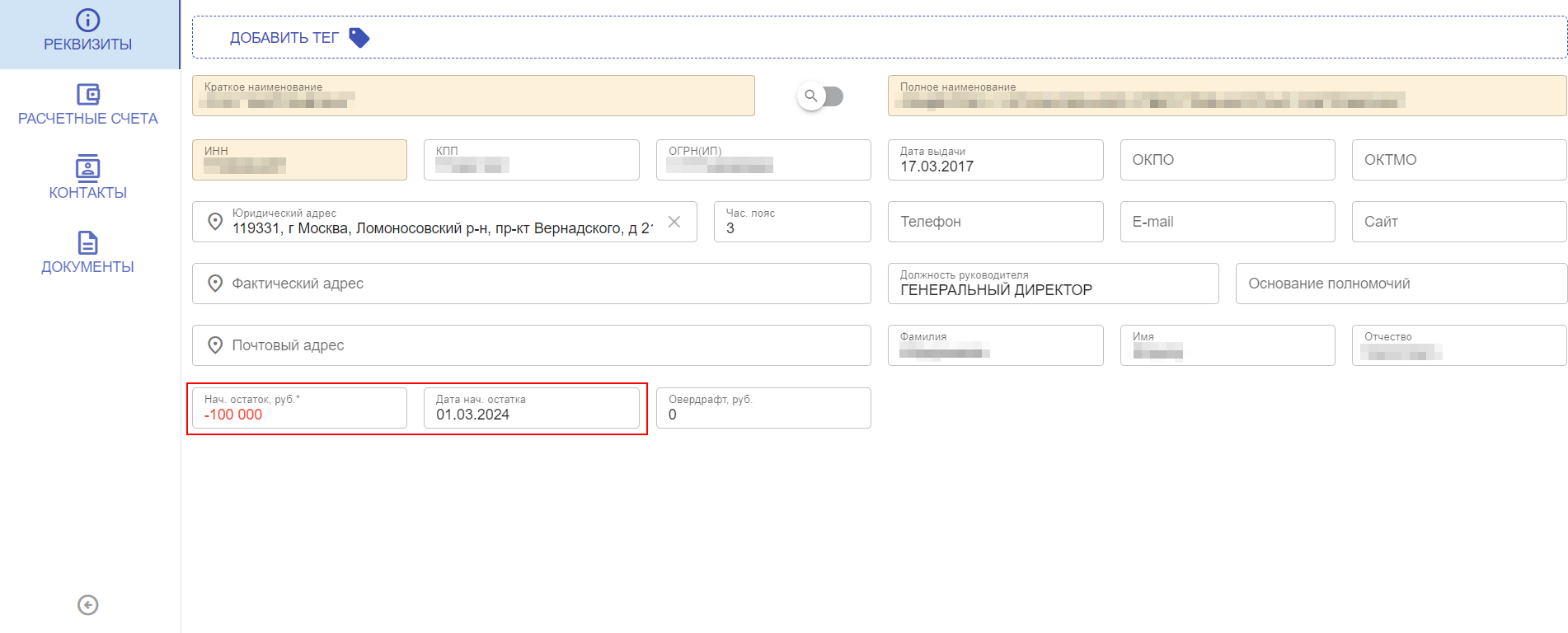 Сальдо начальное. Начальный остаток, который Вы можете указать в форме редактирования контрагента. Во вкладке "Нач. остатки/Овердрафт" в случае мультифирменного учета и во вкладке "Реквизиты" в случае, когда учет ведется по одной организации.