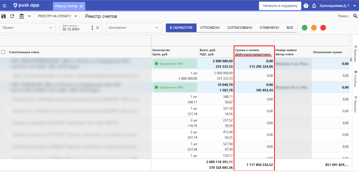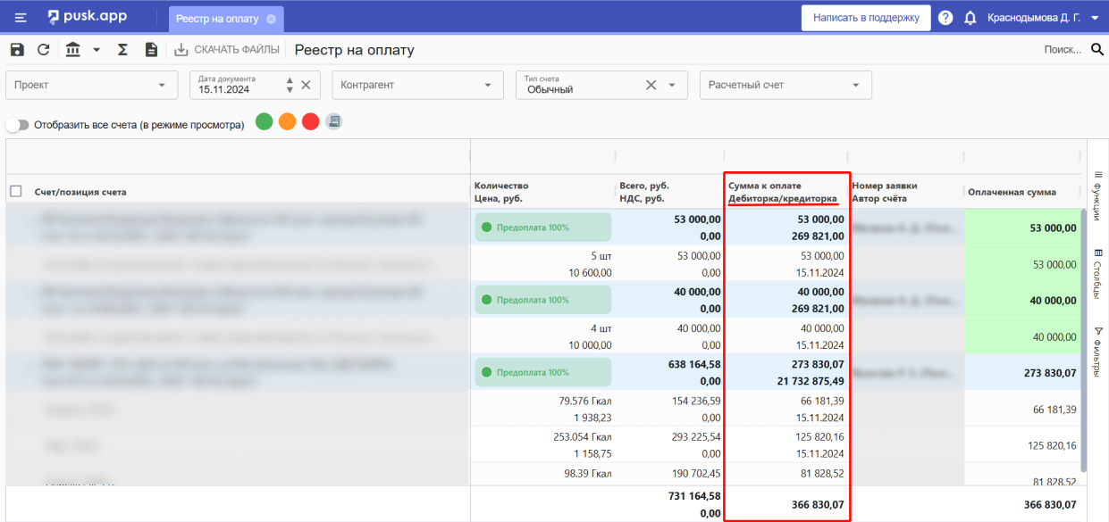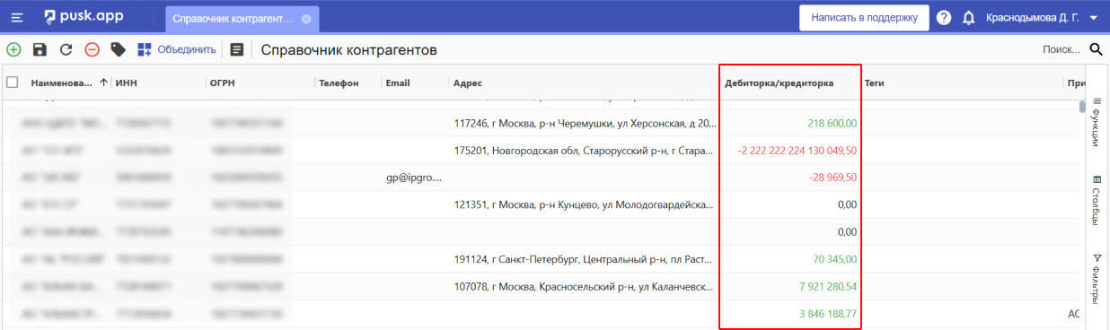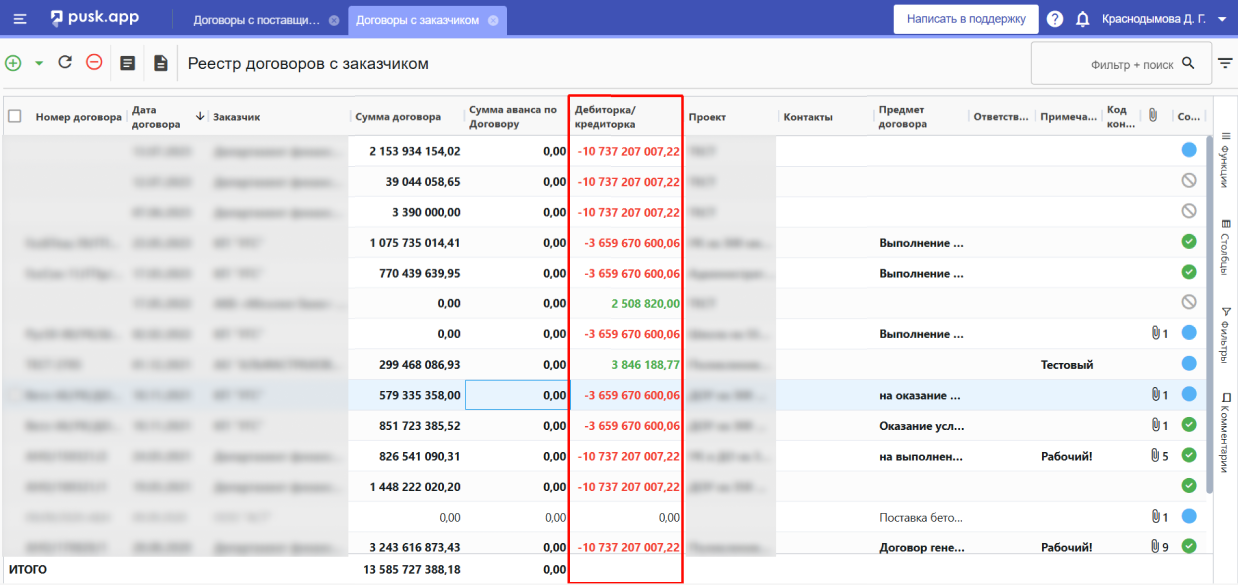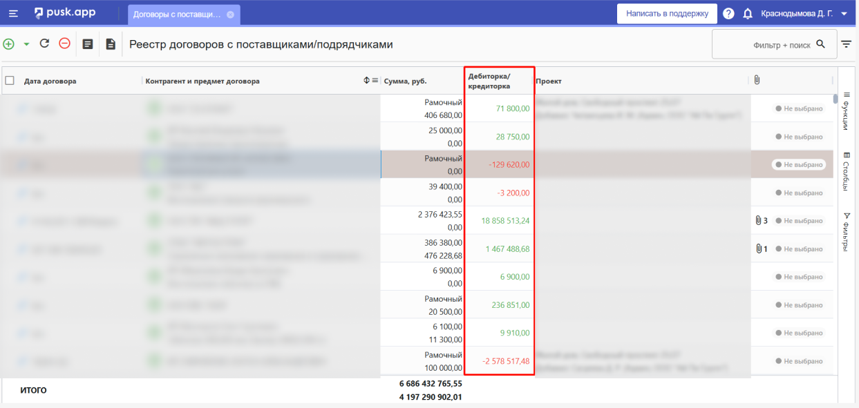 Информация о дебиторской/кредиторской задолженности также отображается в следующих реестрах: