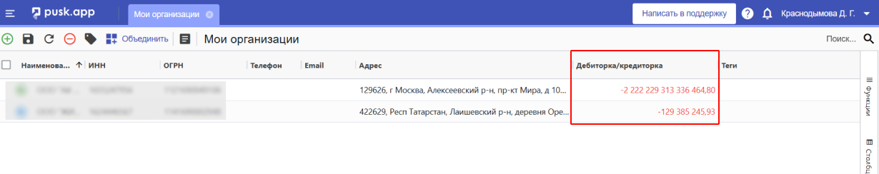 Все показатели в форме просмотра контрагента можно посмотреть по выбранному периоду и в разрезе каждой из организаций в случае, когда компания ведет мультифирменный учет. Если организация не выбрана, то по умолчанию отображаются данные по всем организациям.