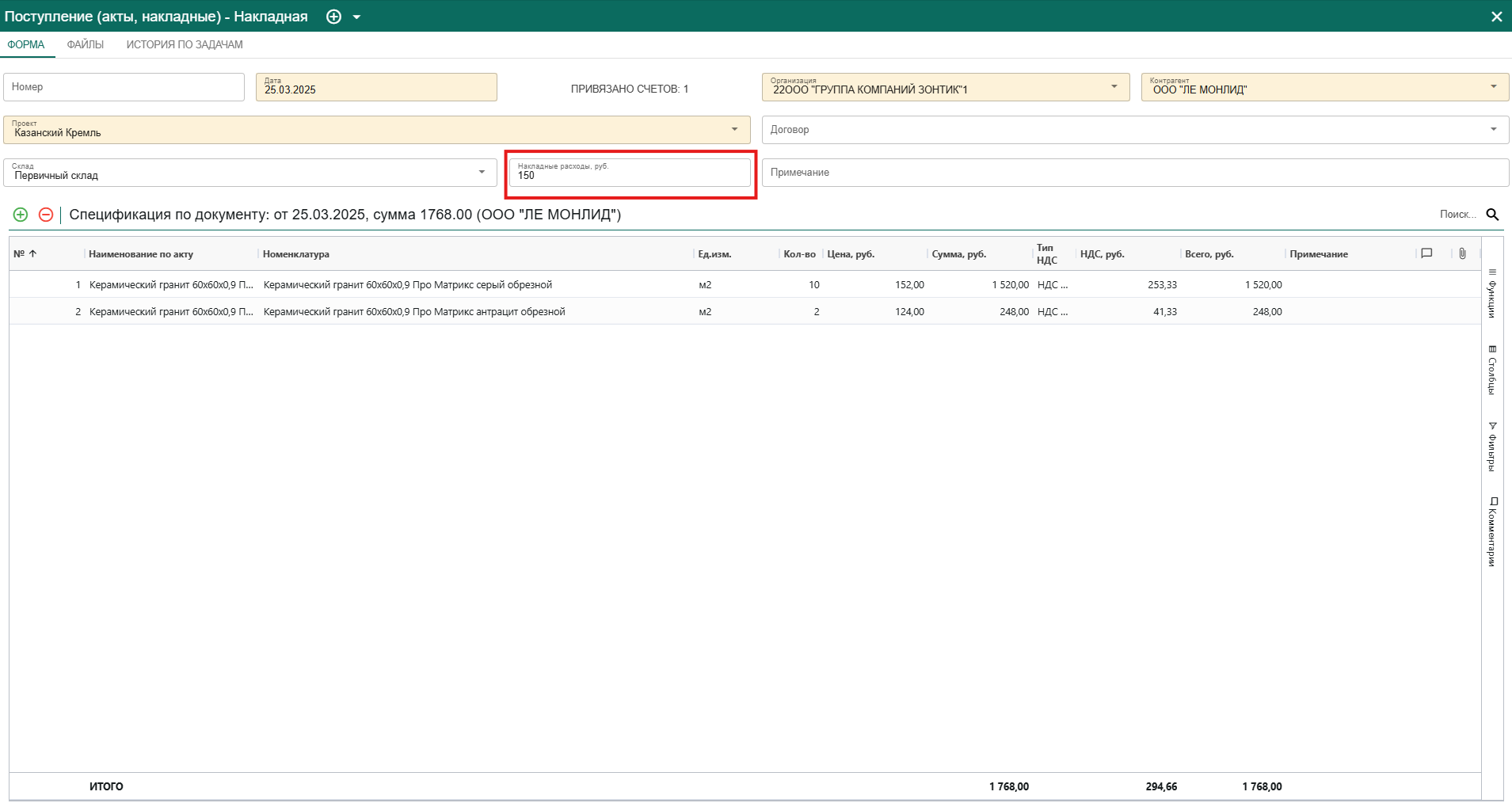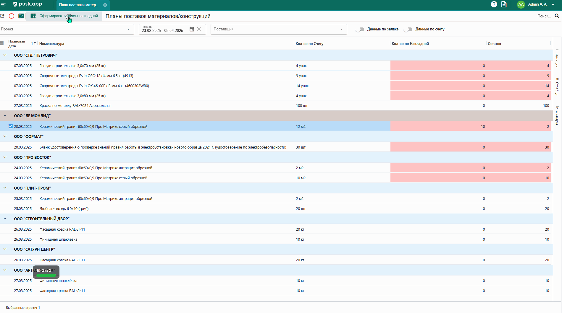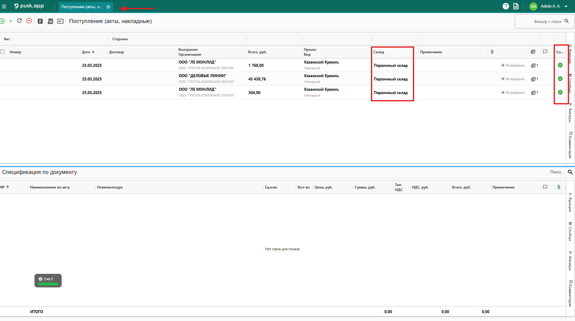 Если в отчете по остаткам отсутствует необходимый материал, хотя он присутствует в Журнале входного контроля, но не отображается в Плане поставок, то ВАЖНО провести проверку статуса Накладной в разделе Поступления (акты/накладные). Необходимо убедиться, что статус накладной установлен как "СОГЛАСОВАН", а в столбце "Склад" указано соответствующее название склада. Аналогично по документу Оприходования.