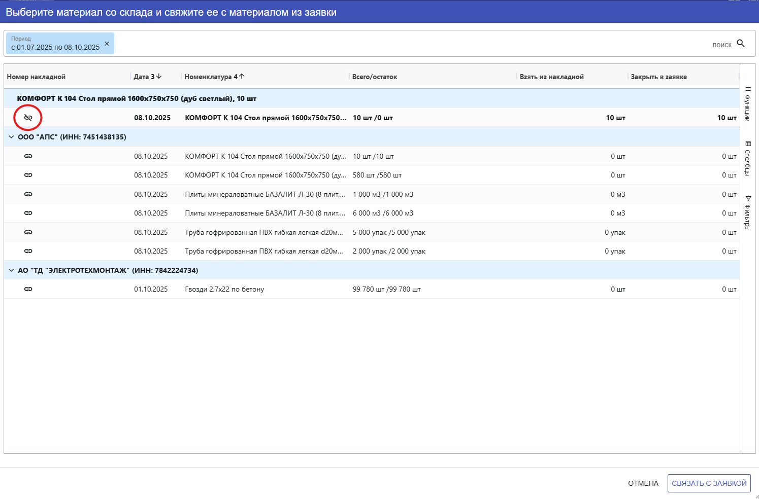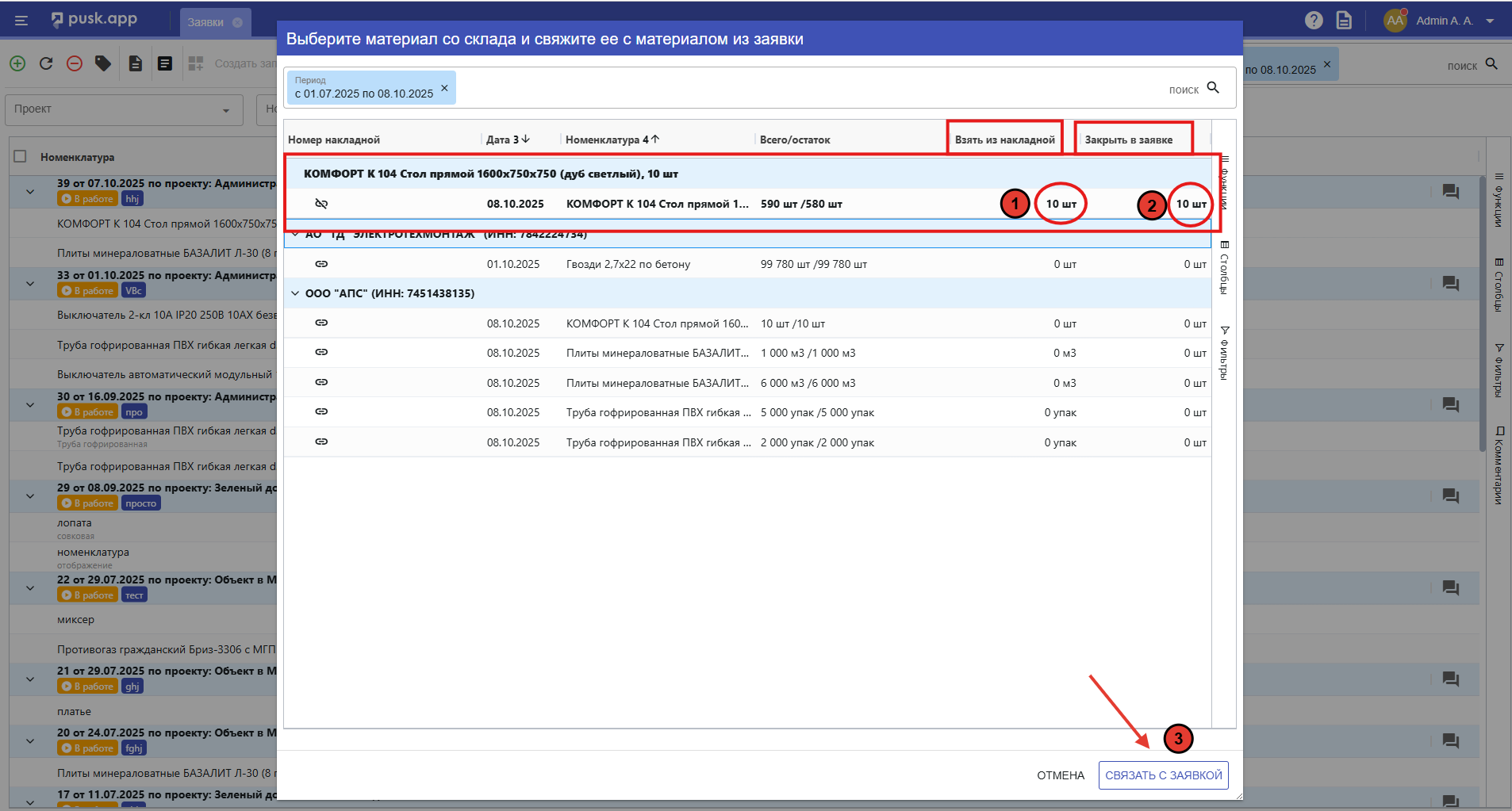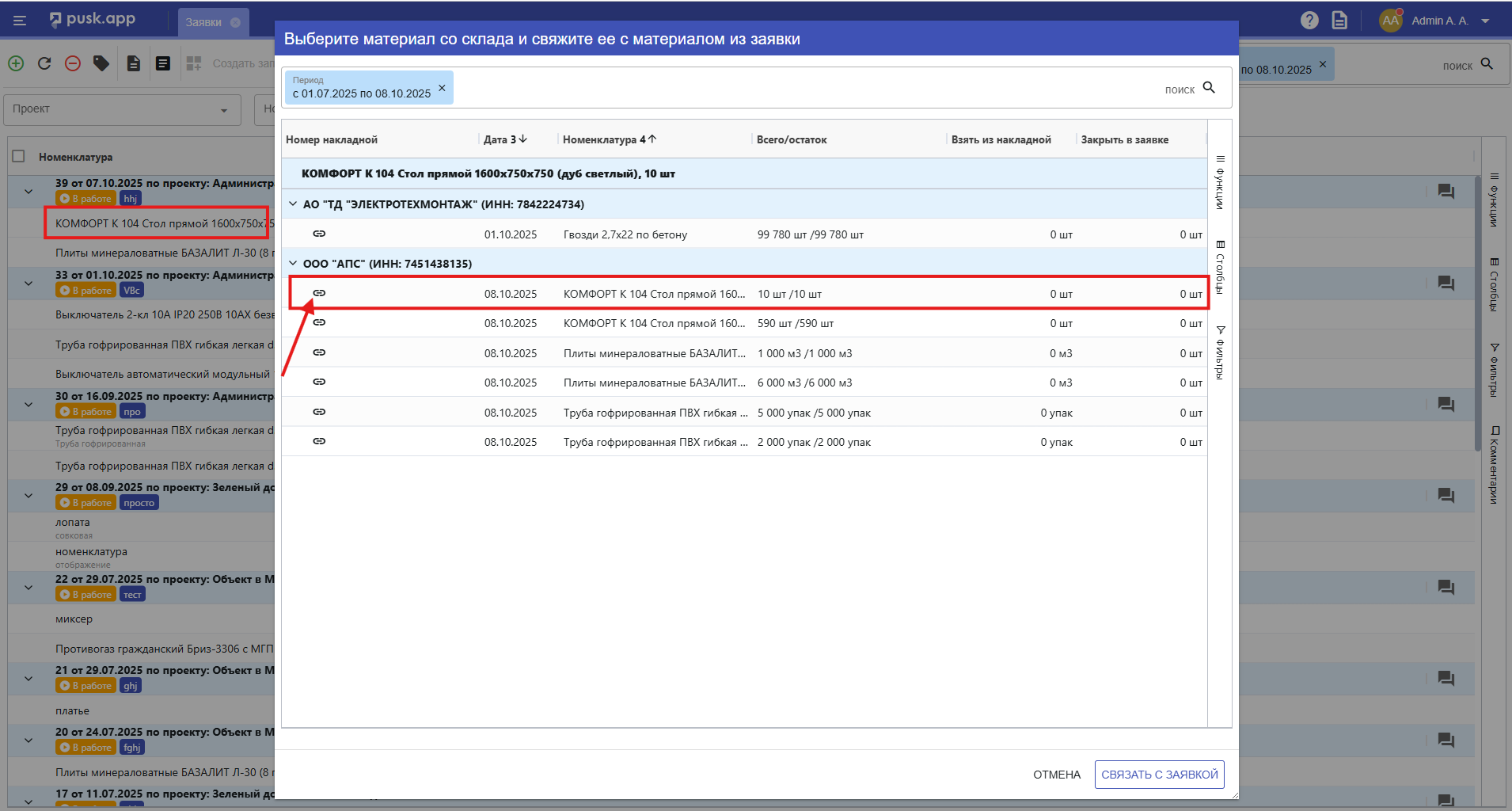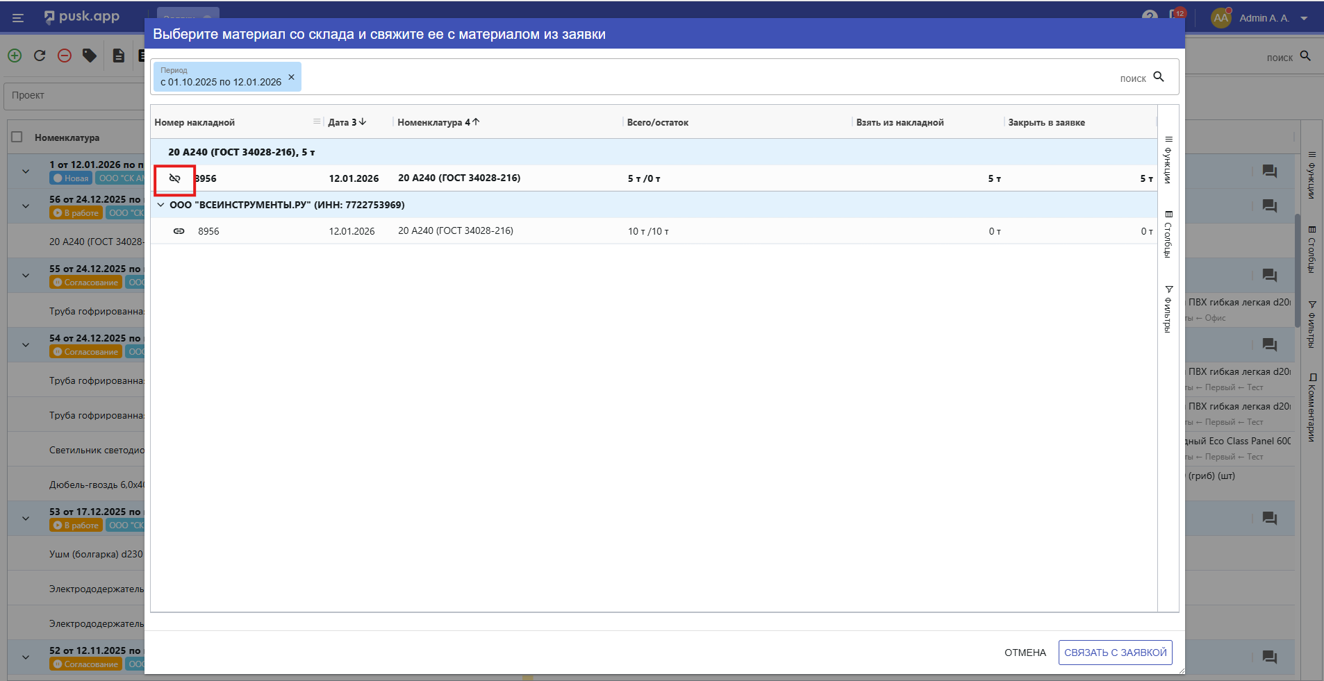 Данный функционал предназначен для упрощения процесса отгрузки материалов со склада и связывания их с заявками.