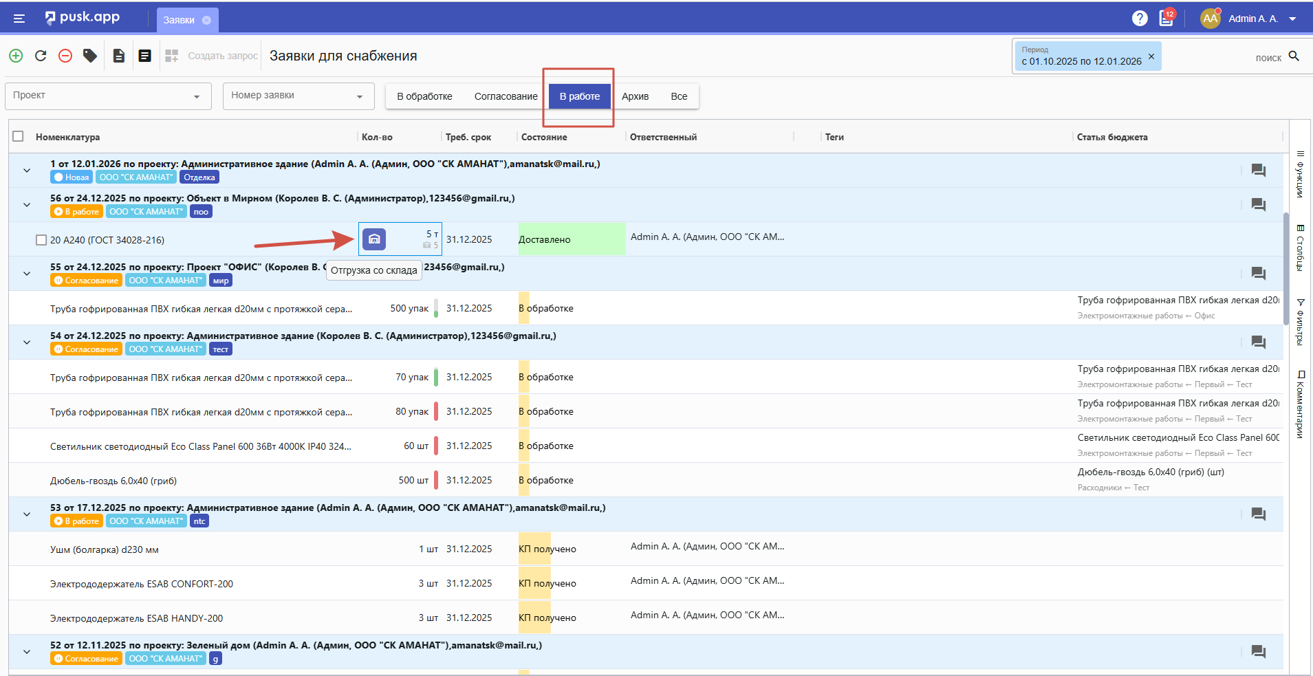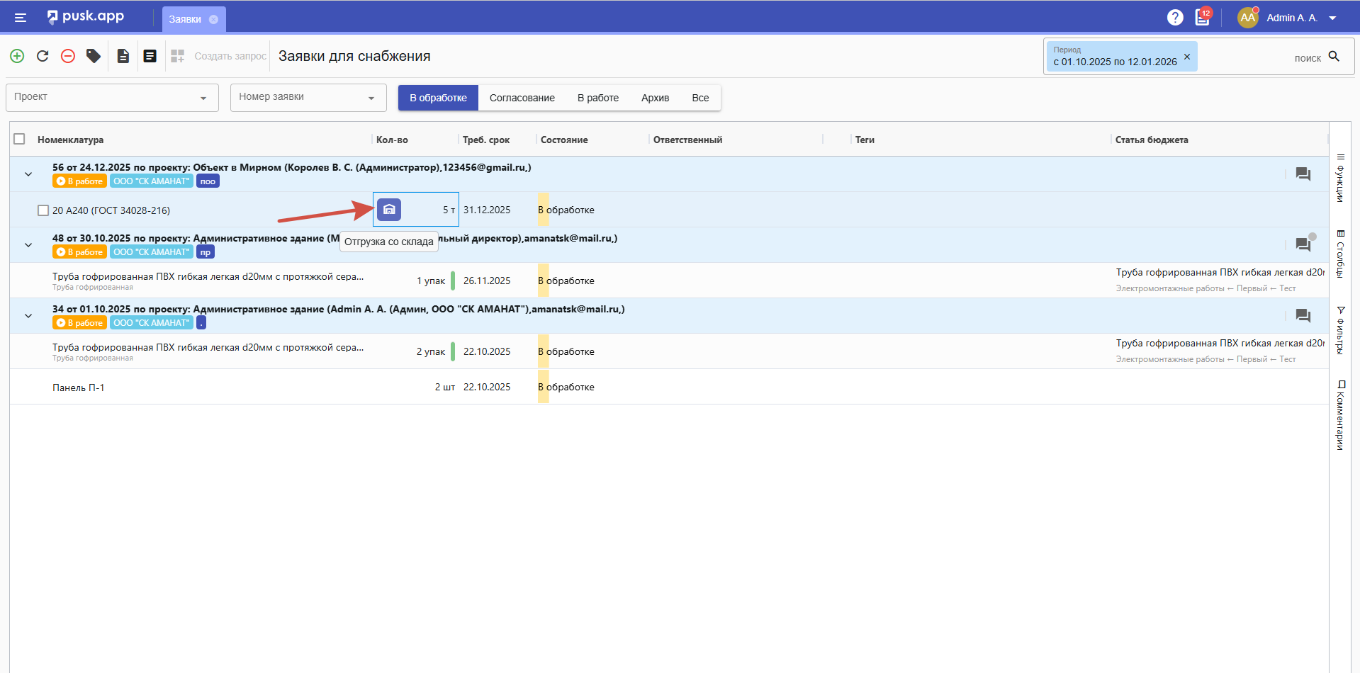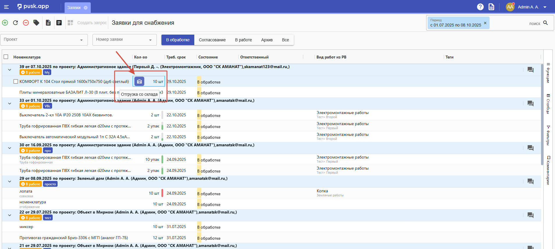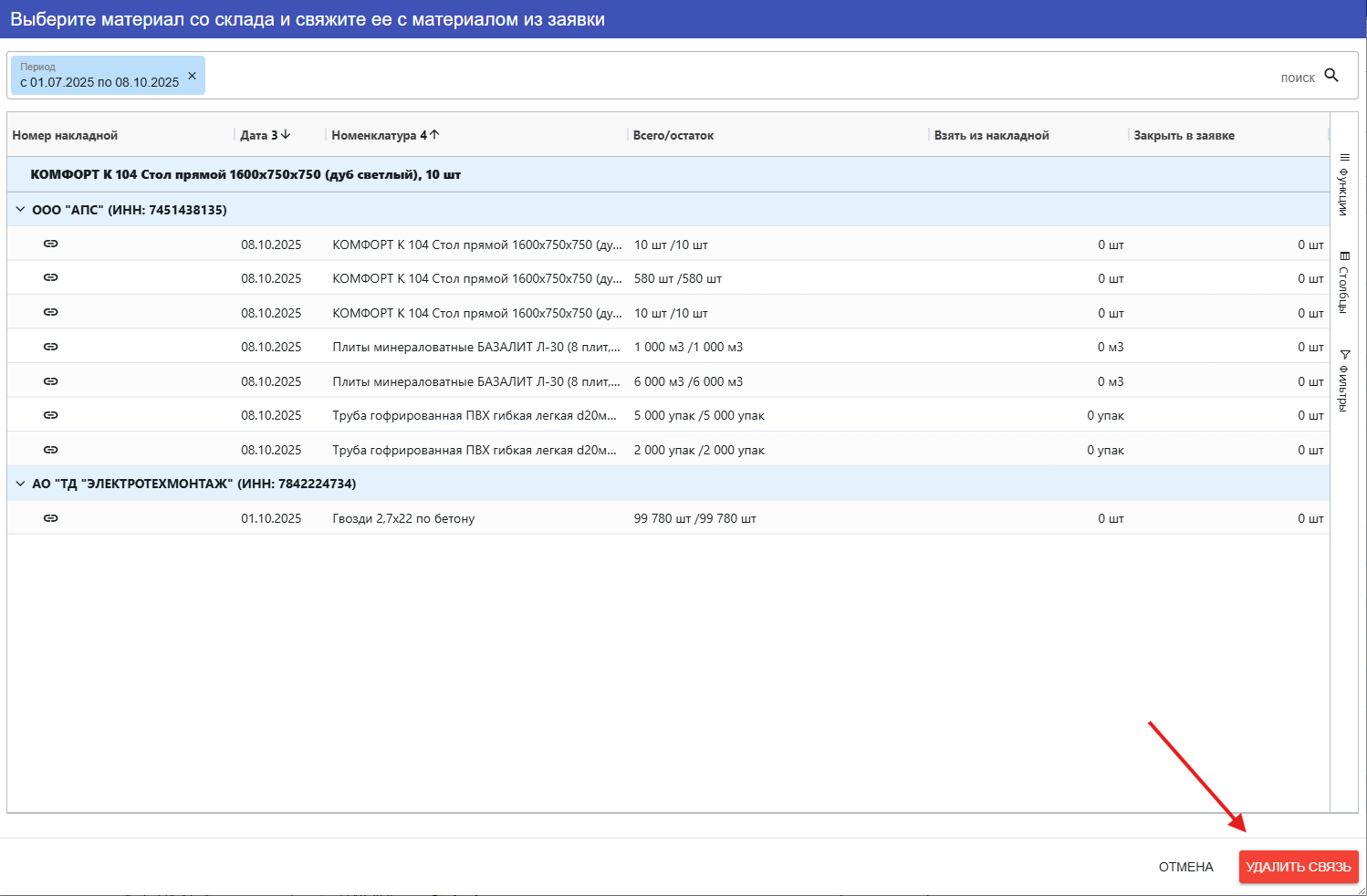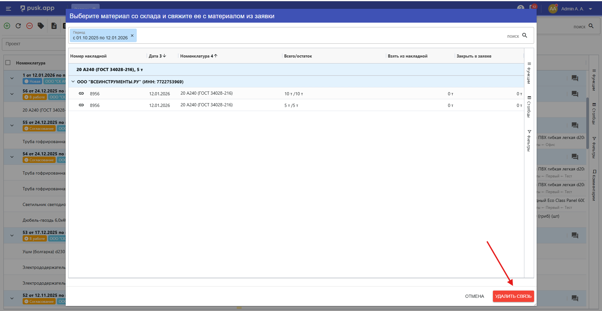 Данный функционал предназначен для упрощения процесса отгрузки материалов со склада и связывания их с заявками.