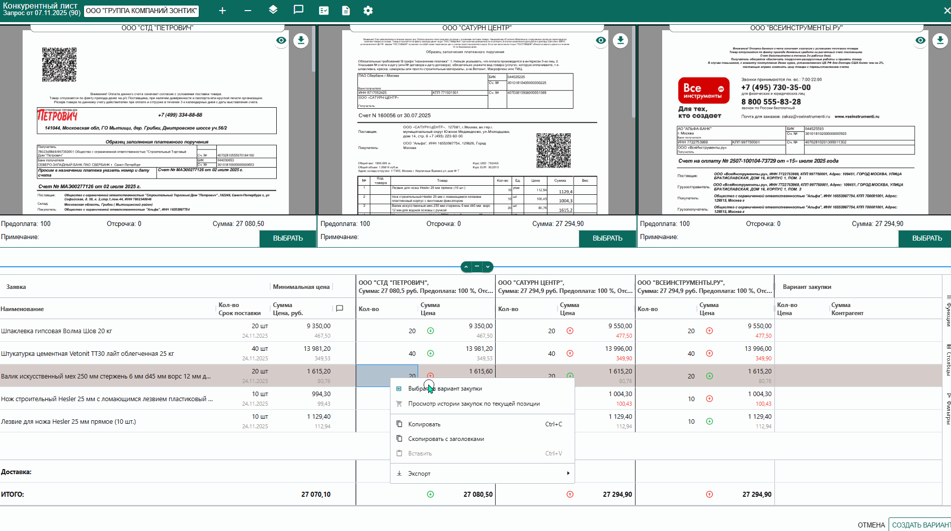Функция доступна в Конкурентном листе. Если требуется у конкретного поставщика перезапросить счет на некоторые позиции, это можно сделать до сохранения варианта закупки и/или с уже сформированным вариантом закупки.