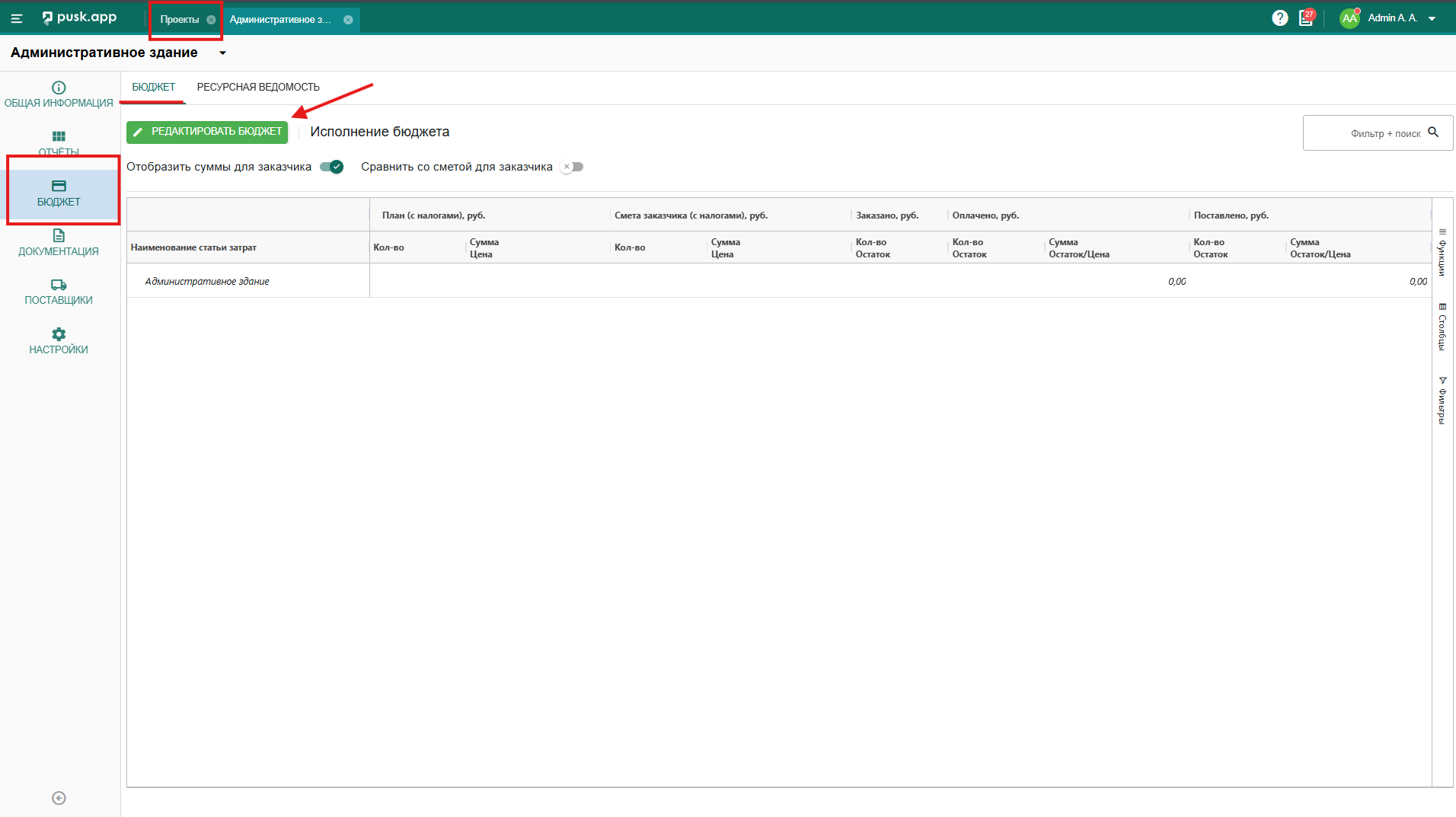 Для добавления Бюджета, необходимо зайти в Справочник проектов, открыть необходимый проект и выбрать соответствующую вкладку.