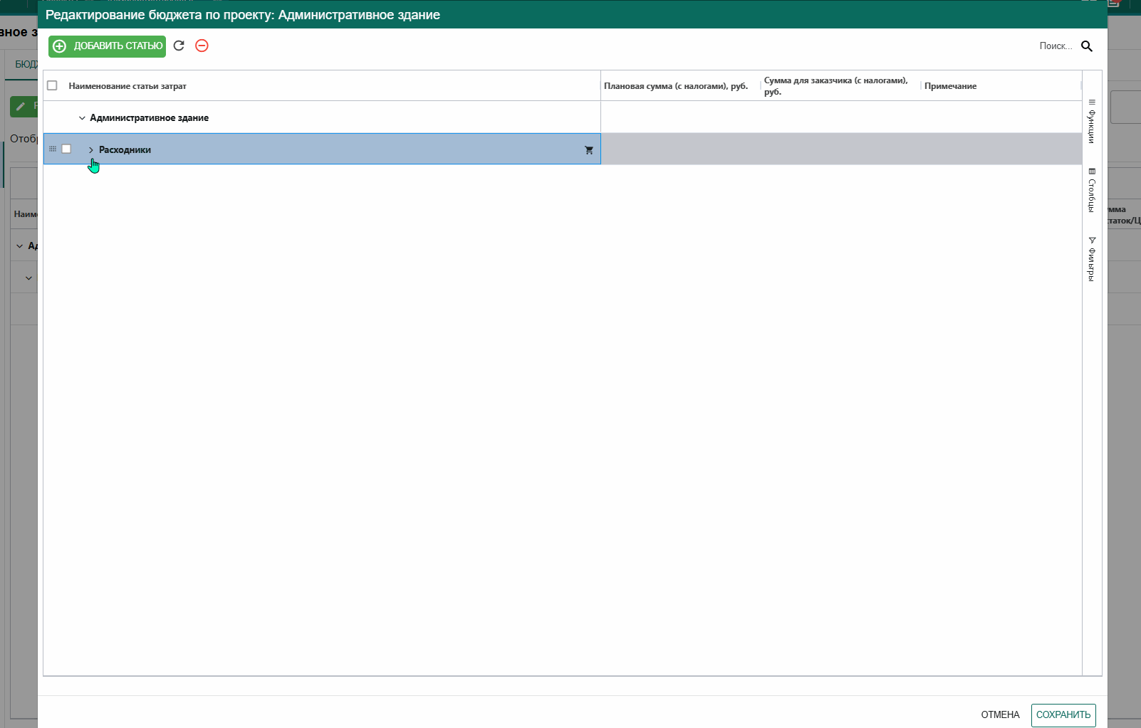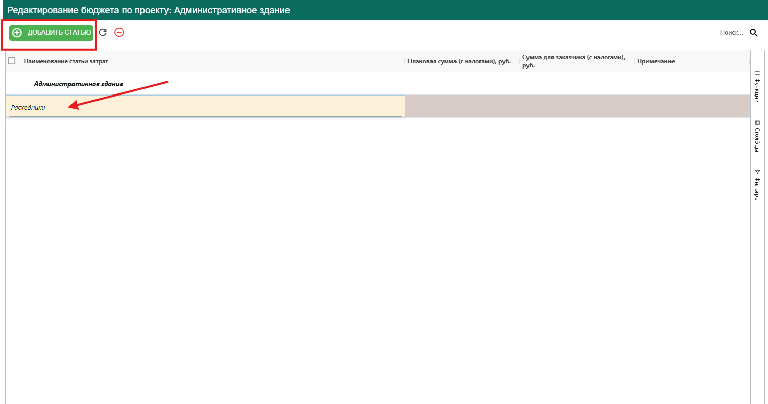 Нажимаем на Редактировать бюджет, откроется форма добавления данных, где выбираем Добавить статью и указываем название Статьи расхода
