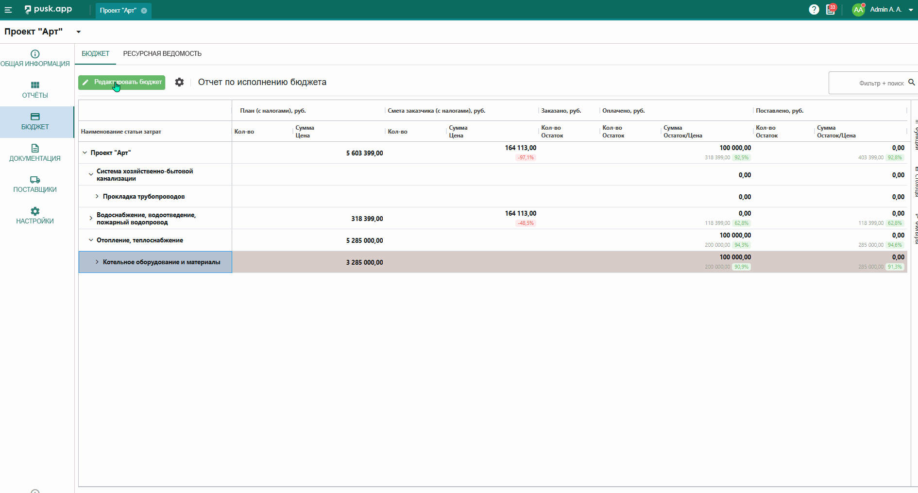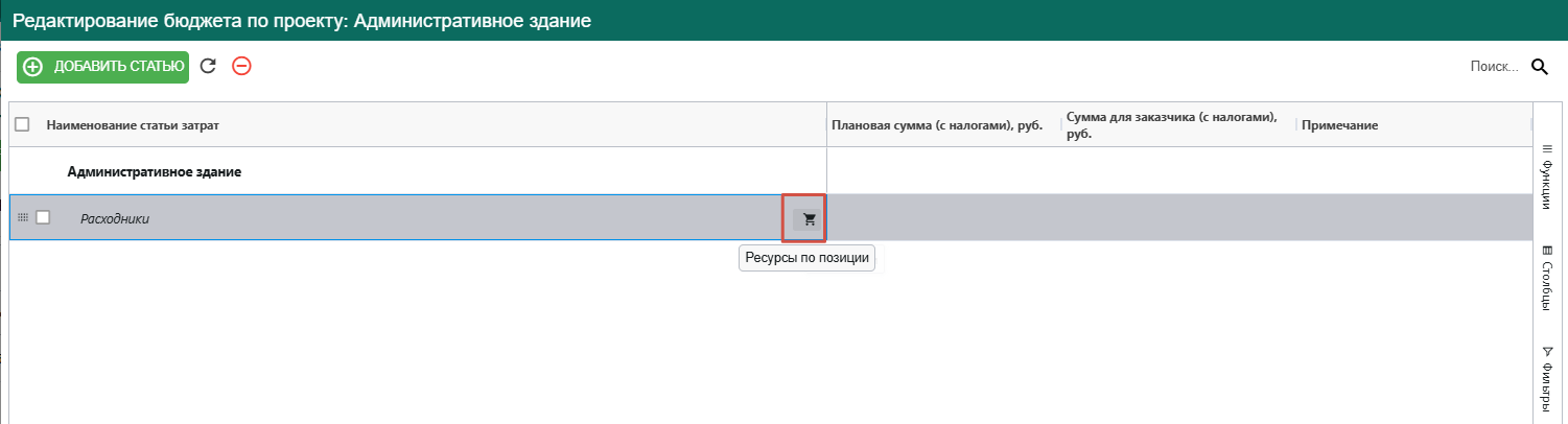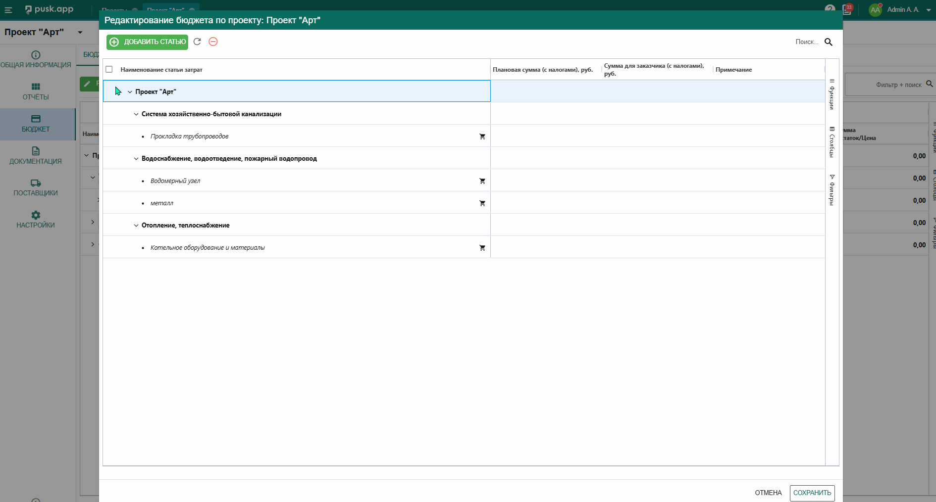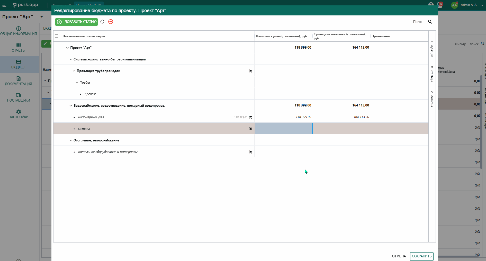 В бюджете выведена отдельной вкладкой информация по материалам, добавленным в бюджет, для отслеживания информации конкретно по номенклатуре.