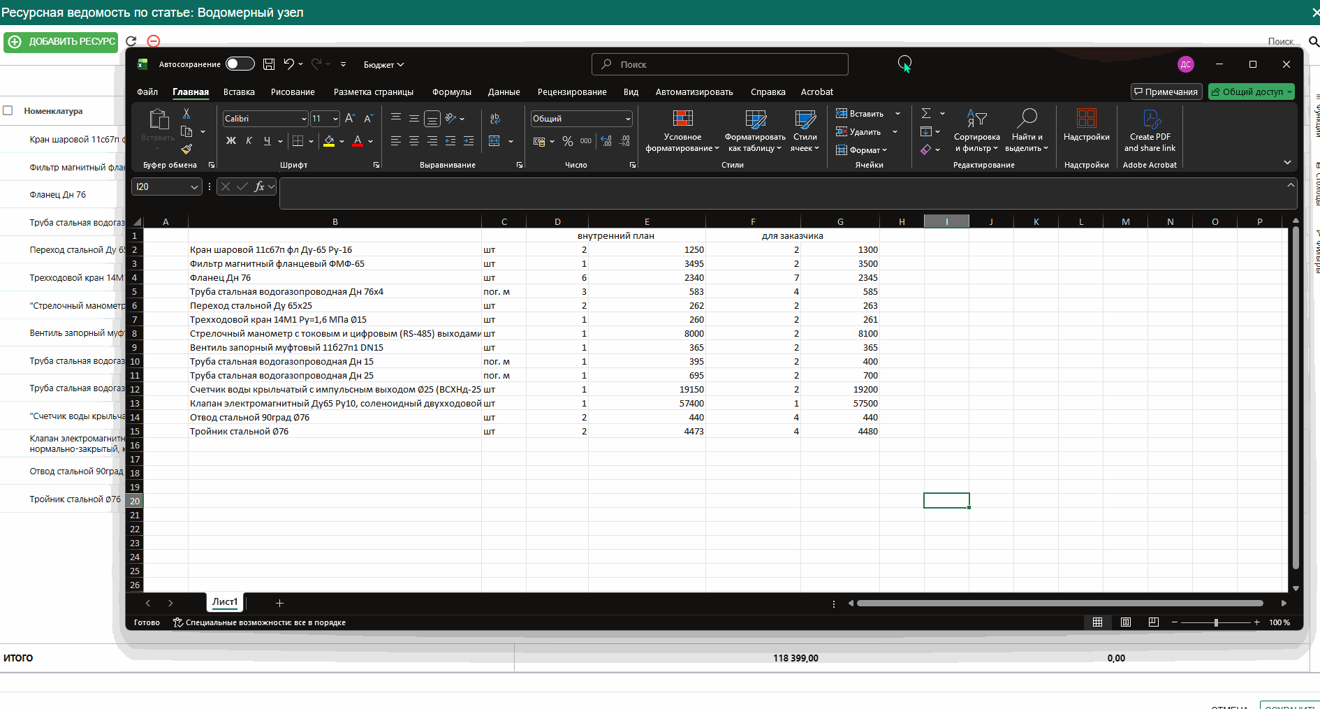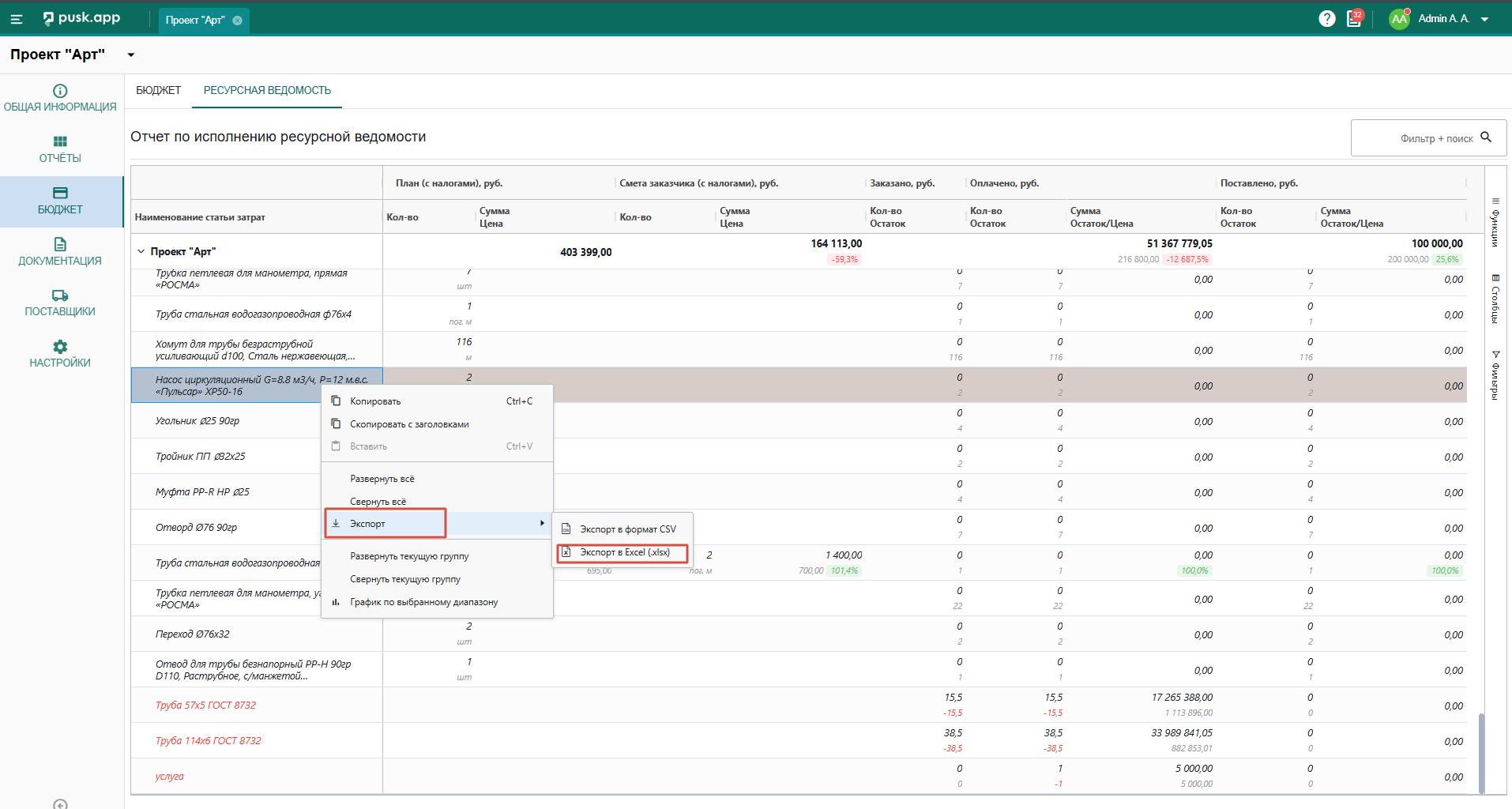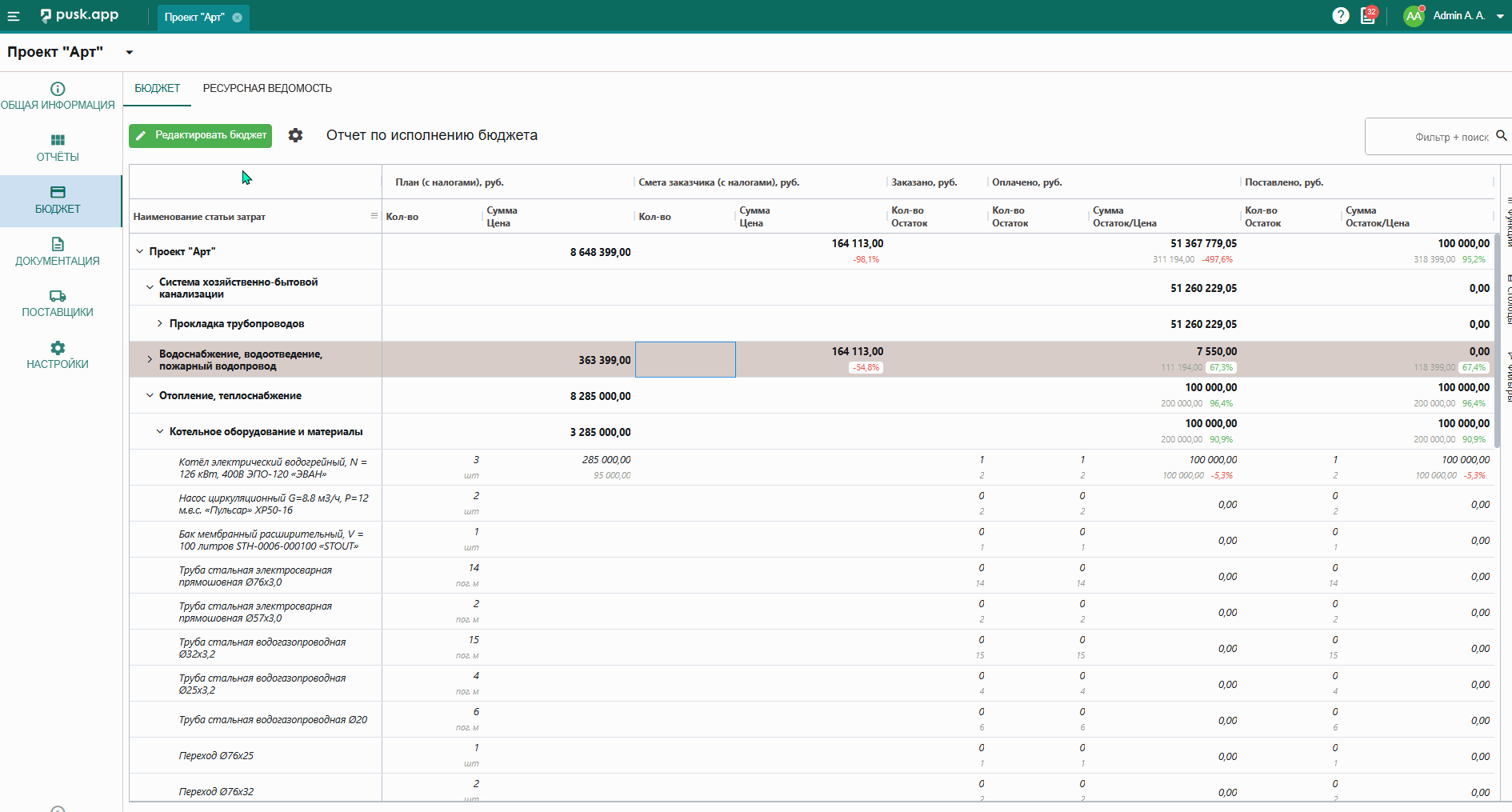 В бюджете выведена отдельной вкладкой информация по материалам, добавленным в бюджет, для отслеживания информации конкретно по номенклатуре.