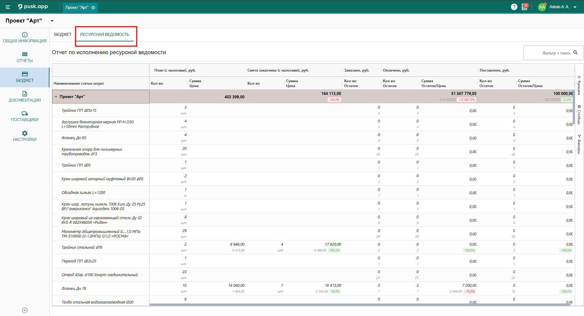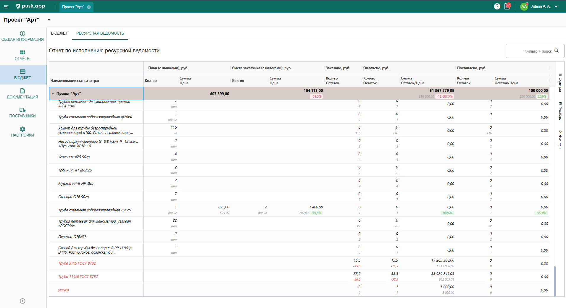 В данном подразделе собирается вся информация по планируемой или уже закупленной номенклатуре. Если материал не добавили к конкретному разделу системы, но заявка/счет/накладная в целом привязаны к статье бюджета, то информация отобразится в данной вкладке и будет выделена красным цветом