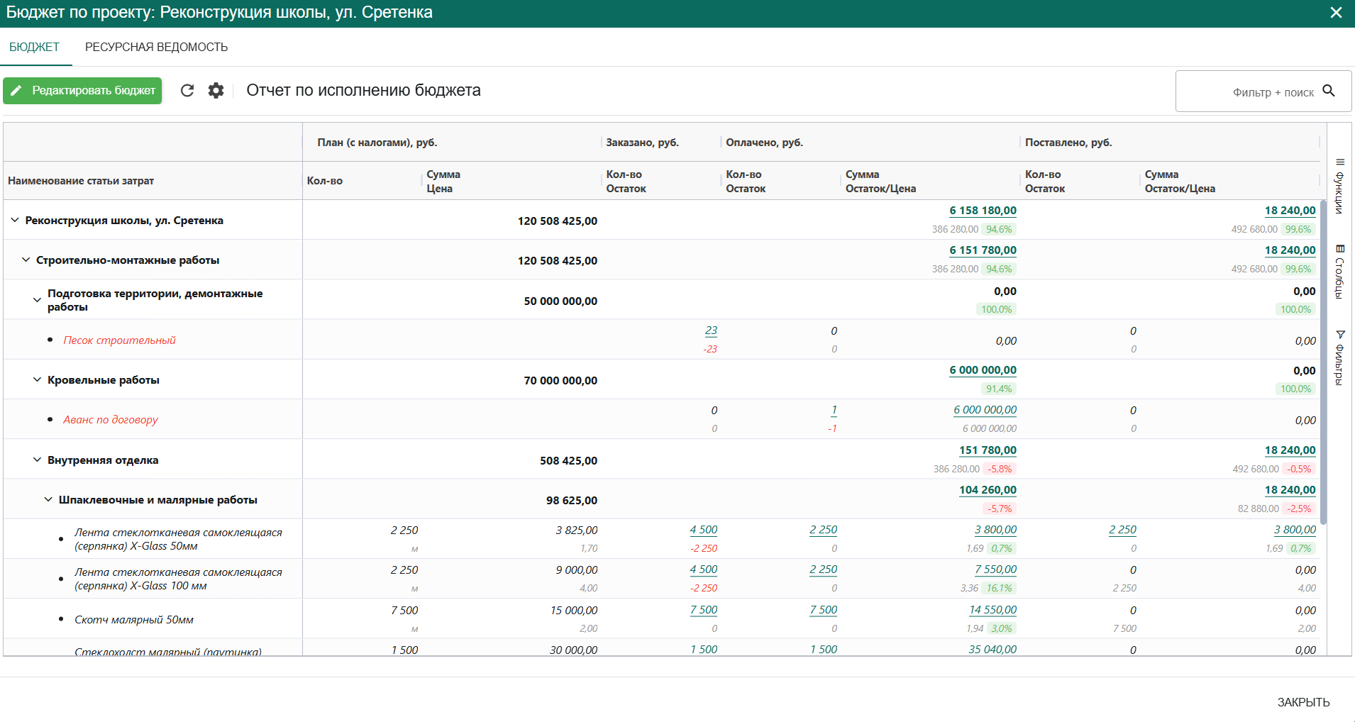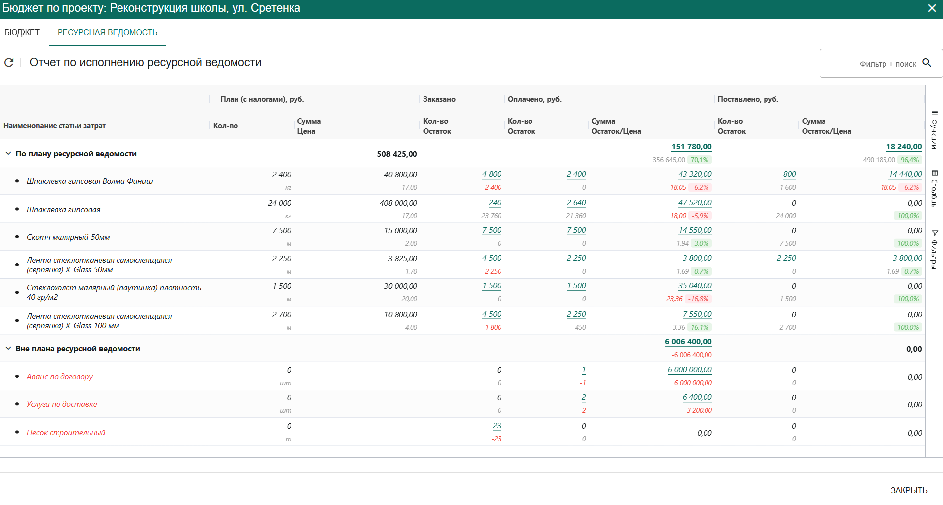 Справа - группы столбцов, которые отображают суммы по плану, сколько было заказано, оплачено и поставлено на объект: