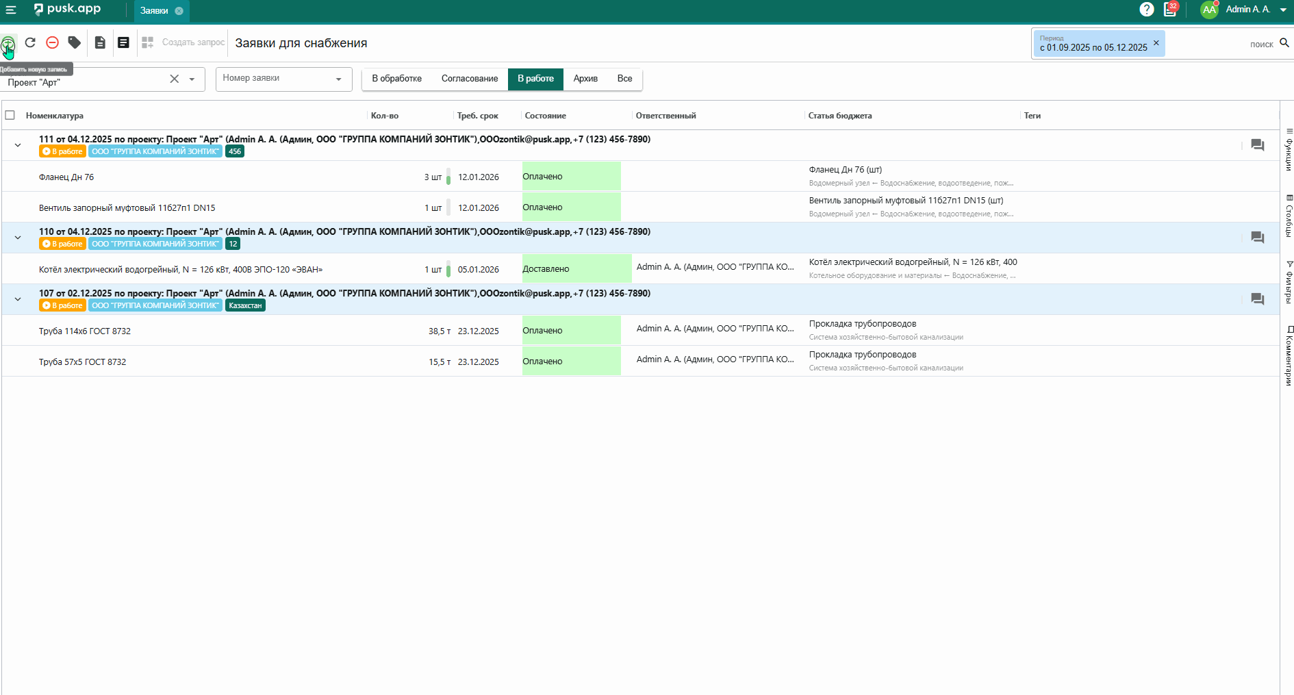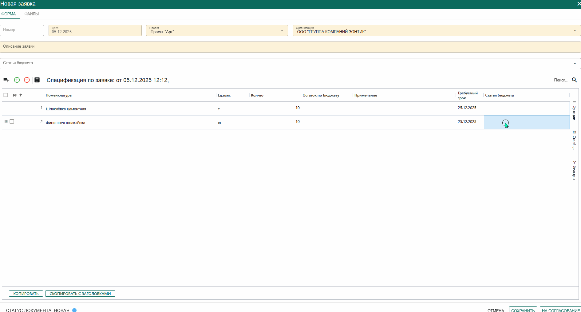 Важно! Если по Заявке в целом или по номенклатуре отдельно не указана статья расходов изначально, то присвоить ее можно будет позднее, если у вас открыты соответствующие права доступа.