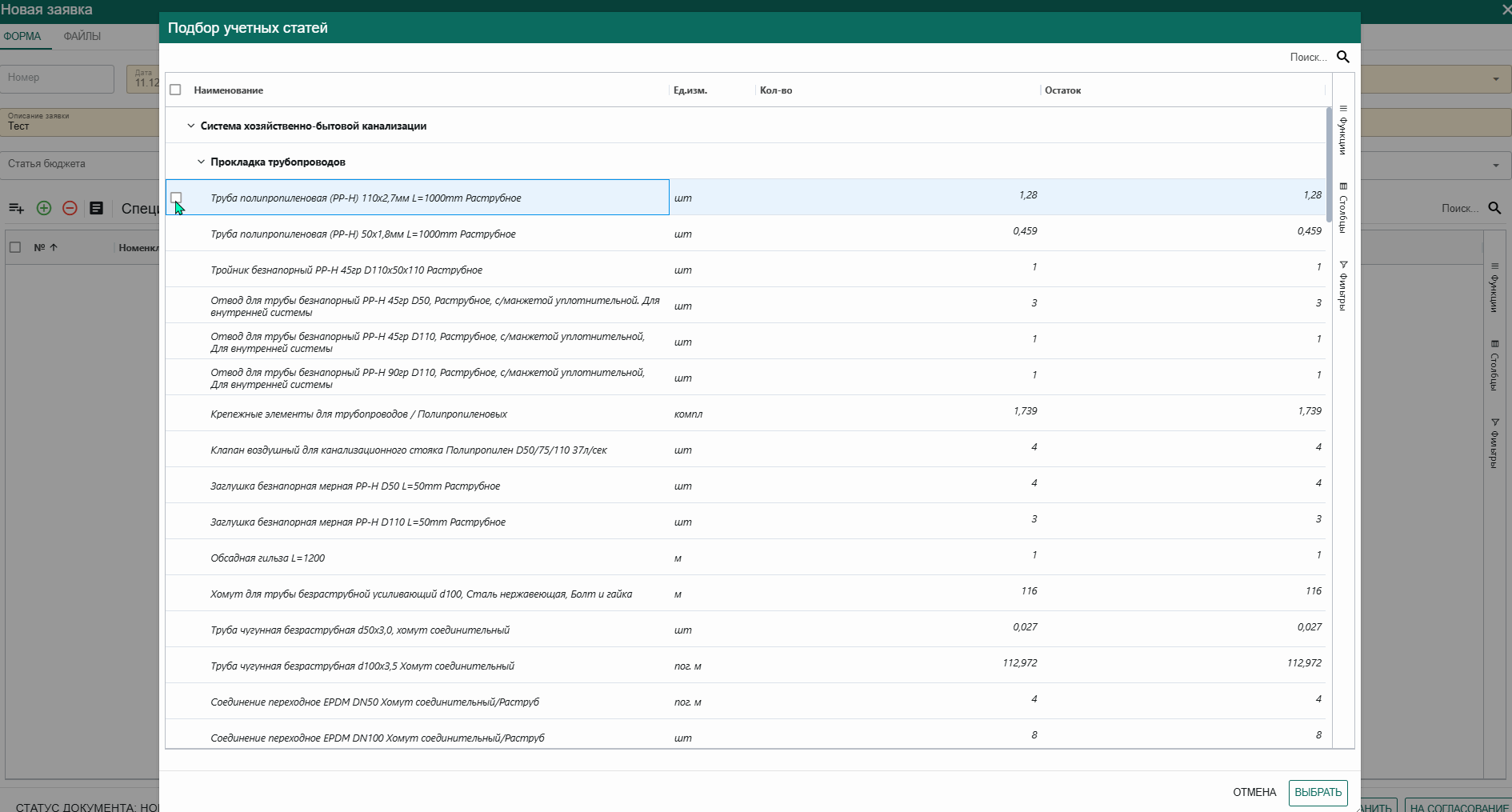 При этом если вы указали в целом по заявке статью расхода или подобрали материал из бюджета, то при смене статьи, затрутся все данные по номенклатуре