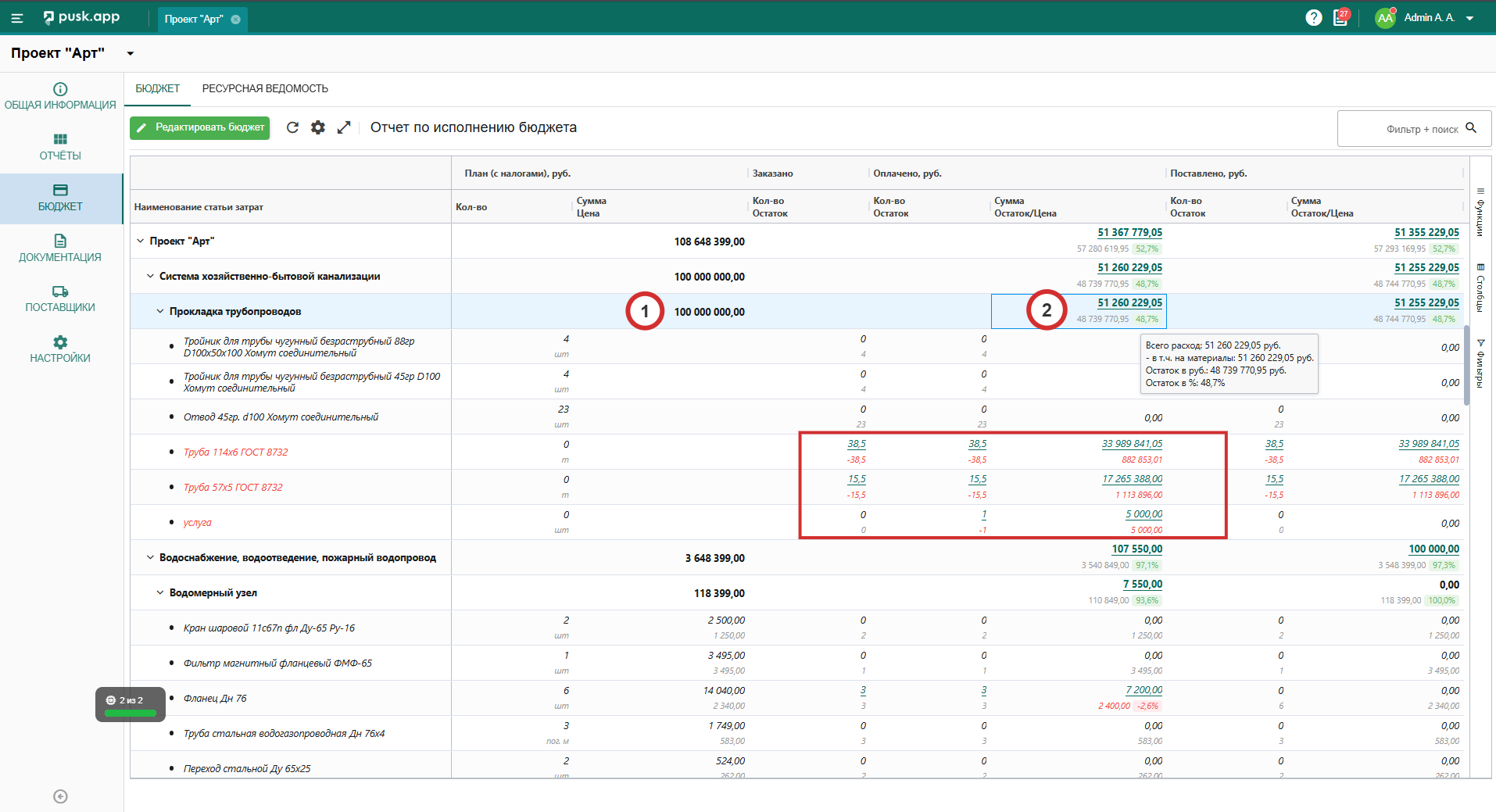 Если навести мышкой на сумму, то выйдет всплывающее окно с суммой все расходов по разделу бюджета, остаток и процент остатка к закупке по запланированной сумме по подразделу/разделу бюджета.